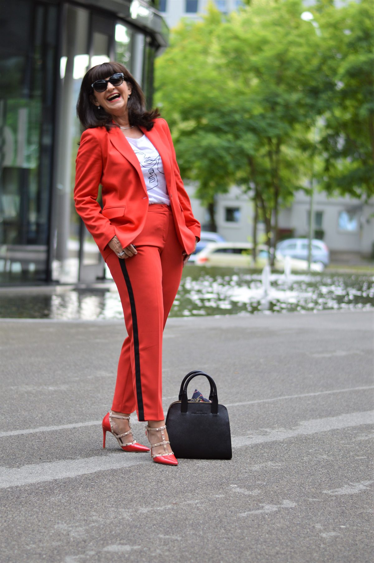 War es früher für mich unvorstellbar unter einem Hosenanzug keine Bluse zu tragen, bin ich heute großzügiger mit dem Darunter. Ein pfiffiges Statement-Shirt kombiniere ich zu meinem roten Hosenanzug. Die Hose hat schwarze Gallonstreifen, die das Bein optisch strecken. Wer möchte denn nicht ewig lange Beine haben?