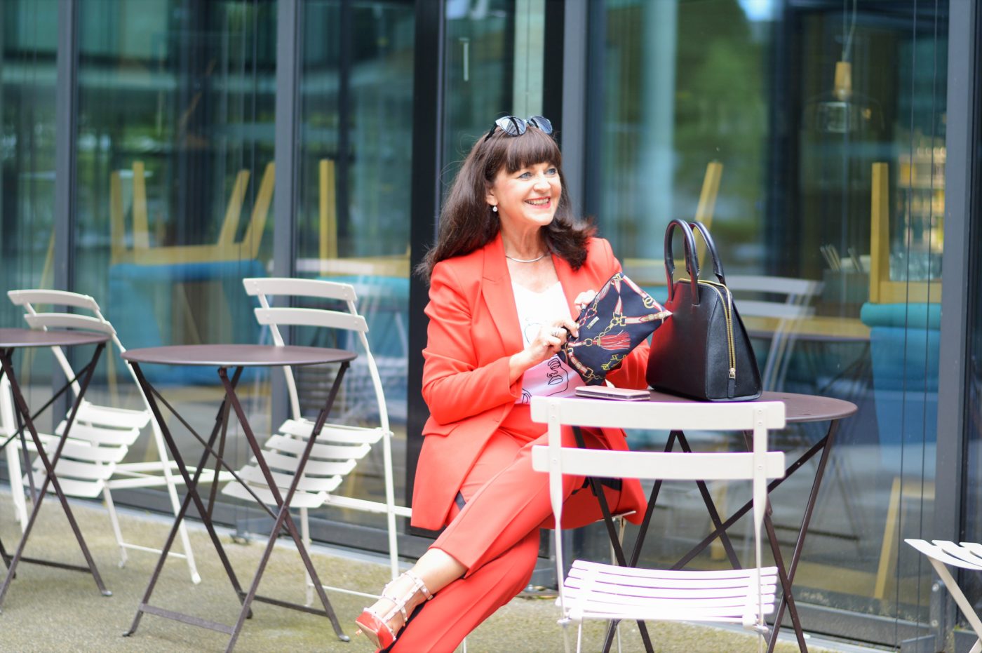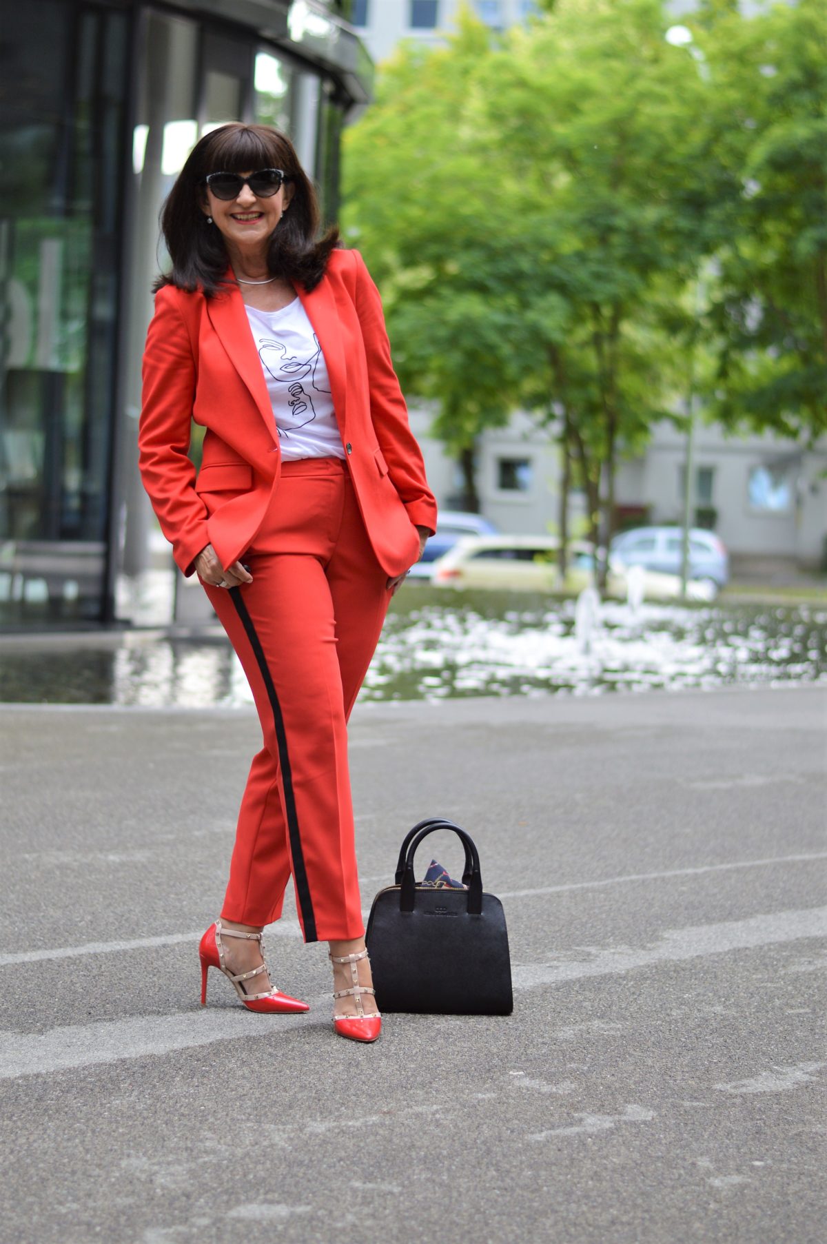 War es früher für mich unvorstellbar unter einem Hosenanzug keine Bluse zu tragen, bin ich heute großzügiger mit dem Darunter. Ein pfiffiges Statement-Shirt kombiniere ich zu meinem roten Hosenanzug. Die Hose hat schwarze Gallonstreifen, die das Bein optisch strecken. Wer möchte denn nicht ewig lange Beine haben?