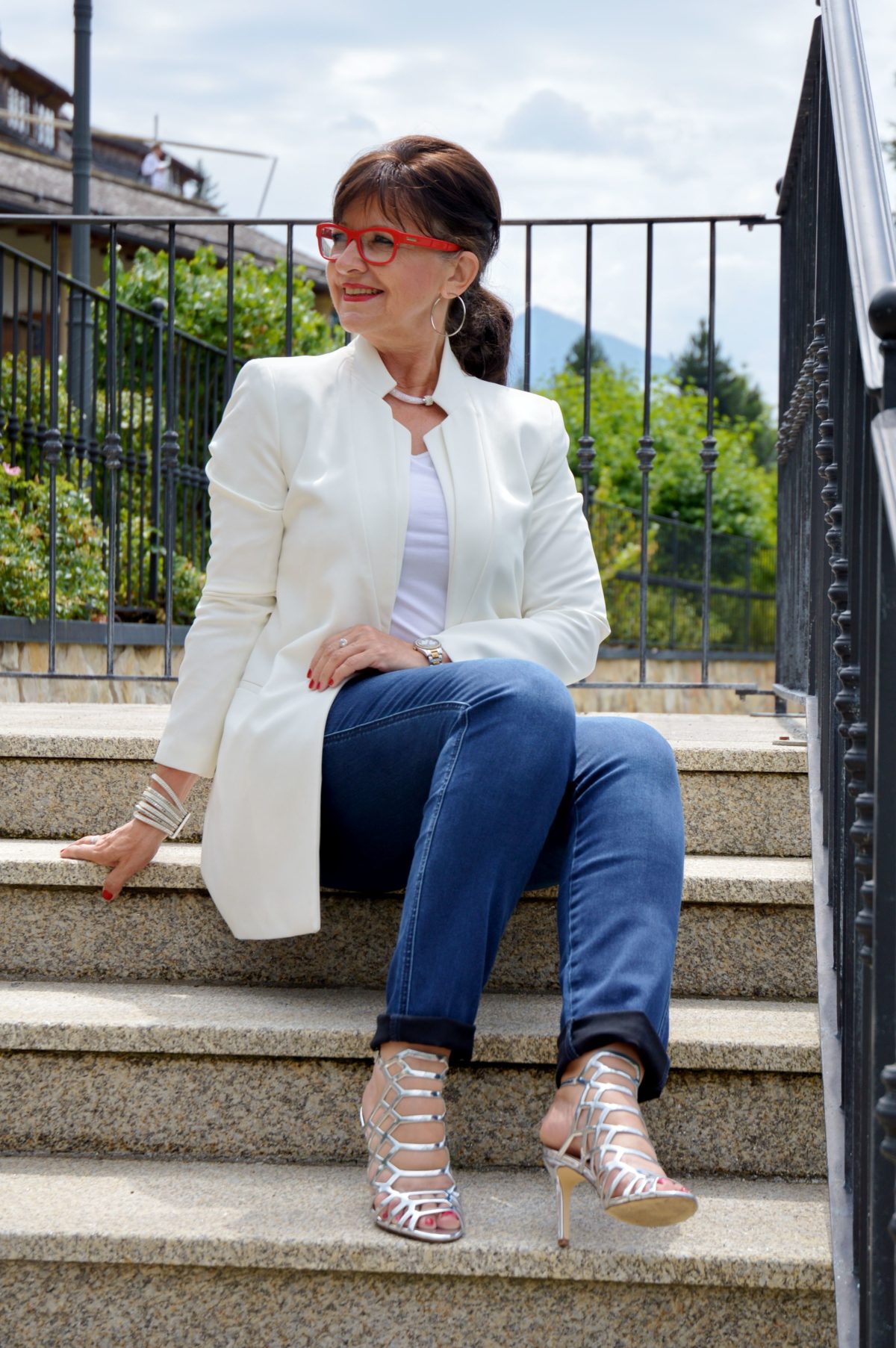 Wir sind noch mitten in der Sommersaison. Wie wäre es, eine Jeans mit offenen, auffälligen Highheels zu kombinieren. Der weiße Longblazer wirkt clean und absolut stilvoll. Für mich eine gute Wahl für ein Dinner in der Urlaubszeit. Es muss ja nicht immer Sneakers, Jeans und Shirt sein, wenn wir ausgehen.