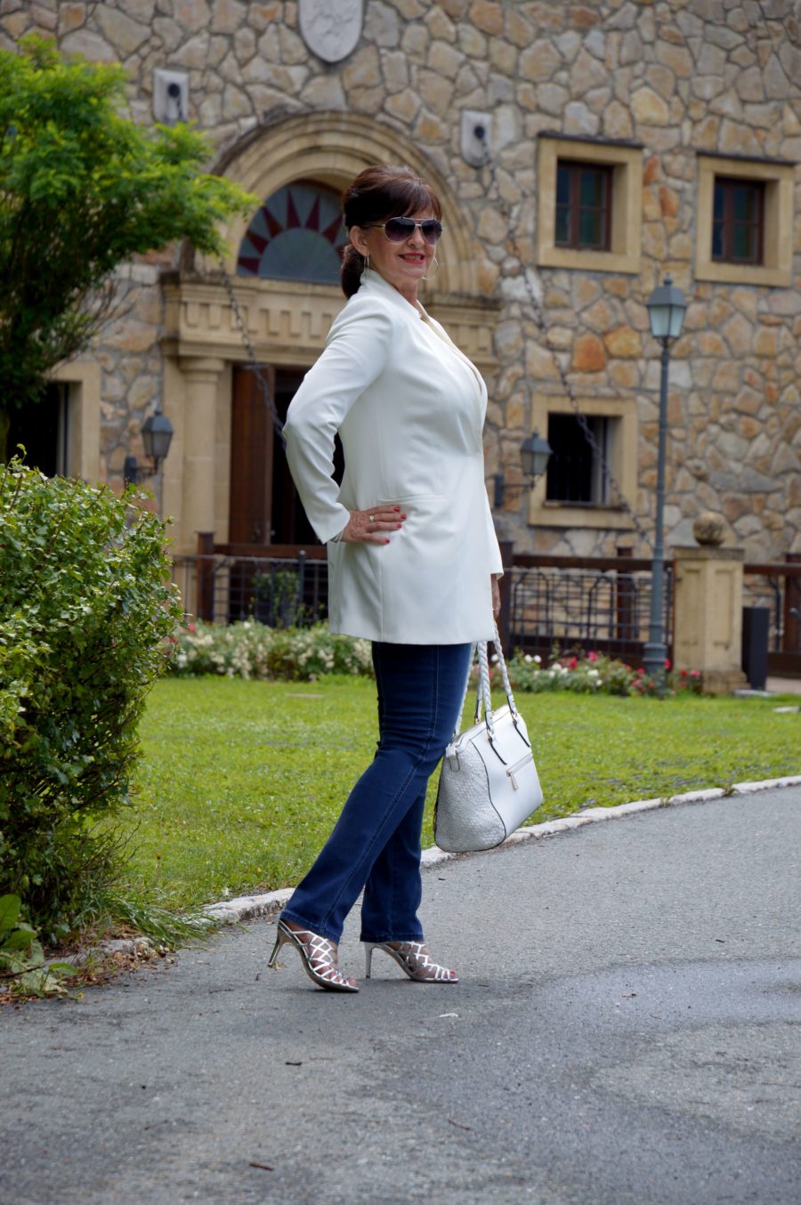 Wir sind noch mitten in der Sommersaison. Wie wĂ€re es, eine Jeans mit offenen, auffĂ€lligen Highheels zu kombinieren. Der weiĂe Longblazer wirkt clean und absolut stilvoll. FĂŒr mich eine gute Wahl fĂŒr ein Dinner in der Urlaubszeit. Es muss ja nicht immer Sneakers, Jeans und Shirt sein, wenn wir ausgehen.