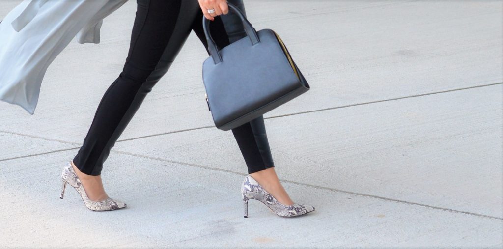 Sehr angetan bin ich von den schwarzen Lederleggings mit den unterschiedlichsten Pumps, die du unterschiedlich kombinierst an zwei Tagen als Outfit einplanst!
