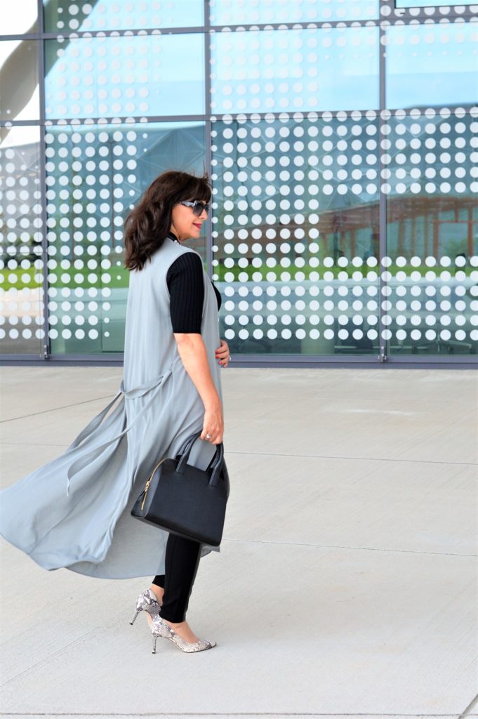 Mein Outfit muss dabei bequem und gleichzeitig schick sein. Die Lederleggings kombiniere ich mit der XL-Maxiweste. Ein toller Kombipartner ist die extrem lange Weste, da sie das gesamte Erscheinungsbild optisch unterbricht. Mit einem breiten Gürtel setze ich die Taille in Szene. Ob über die Weste oder über den Seidenrolli, beides ist realisierbar, je nach Lust und Laune. Kommt Bewegung ins Spiel, sieht die lange Maxiweste besonders vorteilhaft aus.