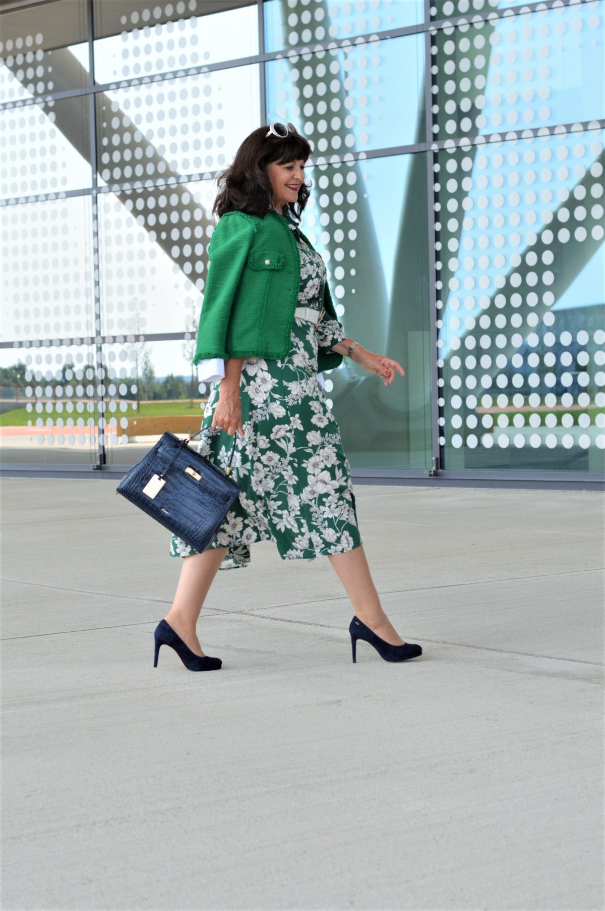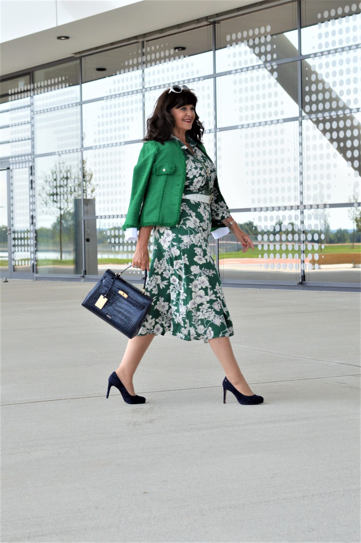 What a gorgeous outfit, Martina! I especially love the navy pumps and bag with this. I am adding a „third color“ more and more to outfits. You are right about the white belt, especially with the boucle blazer. I now know when I am immediately drawn to something in a store and it screams „you need me!“, that I should buy it! This dress looks like that for you, and I love every details of the outfit you’ve put together.
