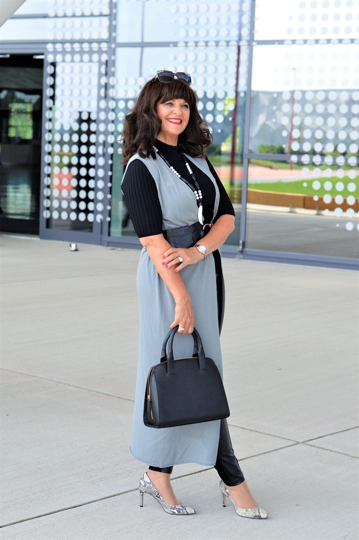 Mein Look setzt sich aus schwarzer Lederleggings, schwarzem Rolli, edler Kette in black-and-white-Musterung, breitem Gürtel und der langen Weste zusammen. Auch hier gilt: Werden die Temperaturen frischer, trage ich eine langärmelige schwarze Bluse oder einen Rolli mit langen Ärmeln darunter. Wichtig ist bei diesem Look, dass im Oberkörperbereich durchaus ein Hingucker an Accessoires zum Einsatz kommt. Meine schwarz-weiße-Kette von Beate Haas Design ist wie dafür gemacht.