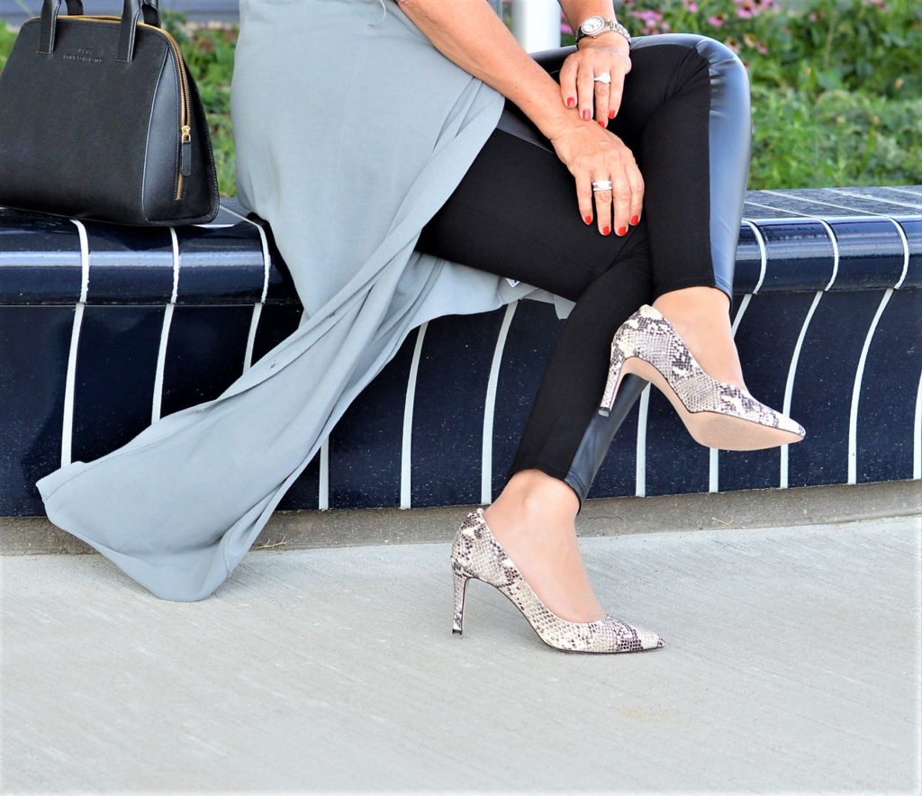 schwarz-weißes Outfit? Habe ich gar nicht vorgestellt. Die lange Weste ist in einem hellen Grau. Die Lederleggings schmeichelt jeder Figur, das sie enorm viel Elasthan beinhaltet.