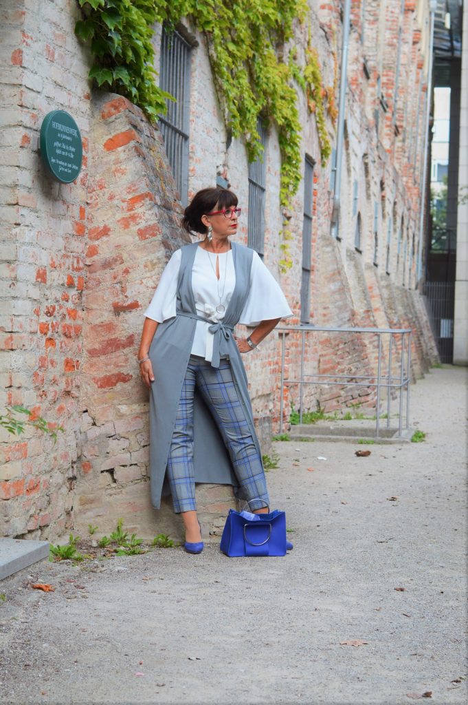 Mein Office Look setzt sich aus einer modischen Karohose, einer weißen Bluse und der langen Weste zusammen. Schicke Pumps, die passende Tasche und fertig ist der cleane Bürolook, der sicherlich alles andere als konservativ ist. Wird es etwas frischer, dann kombiniere ich eine langärmelige weiße Bluse dazu.
