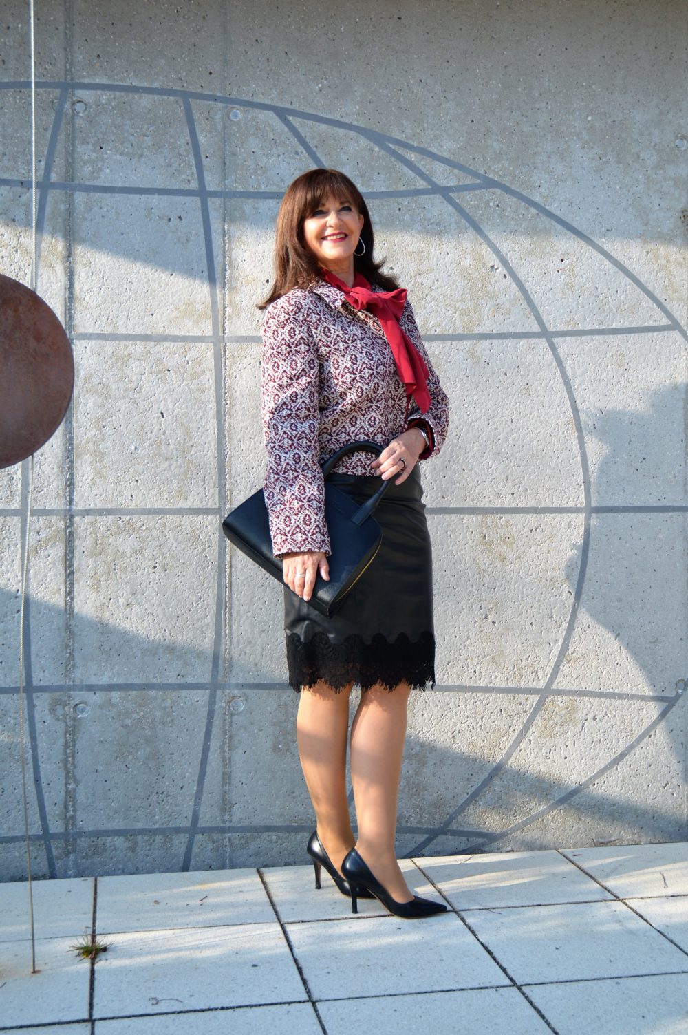 Ein stilvoller Lederrock endet bei mir nicht über dem Knie. Um edel und stylisch zu wirken, sollte die Rocklänge knieumspielend sein. Mein Lederrock hat am Saum eine ganz zarte Spitze. Lederröcke gibt es in dieser Saison sowohl in Glatt- als auch in Wildleder. Unter meinem Boucle-Blazer trage ich eine zarte rote Schluppenbluse.