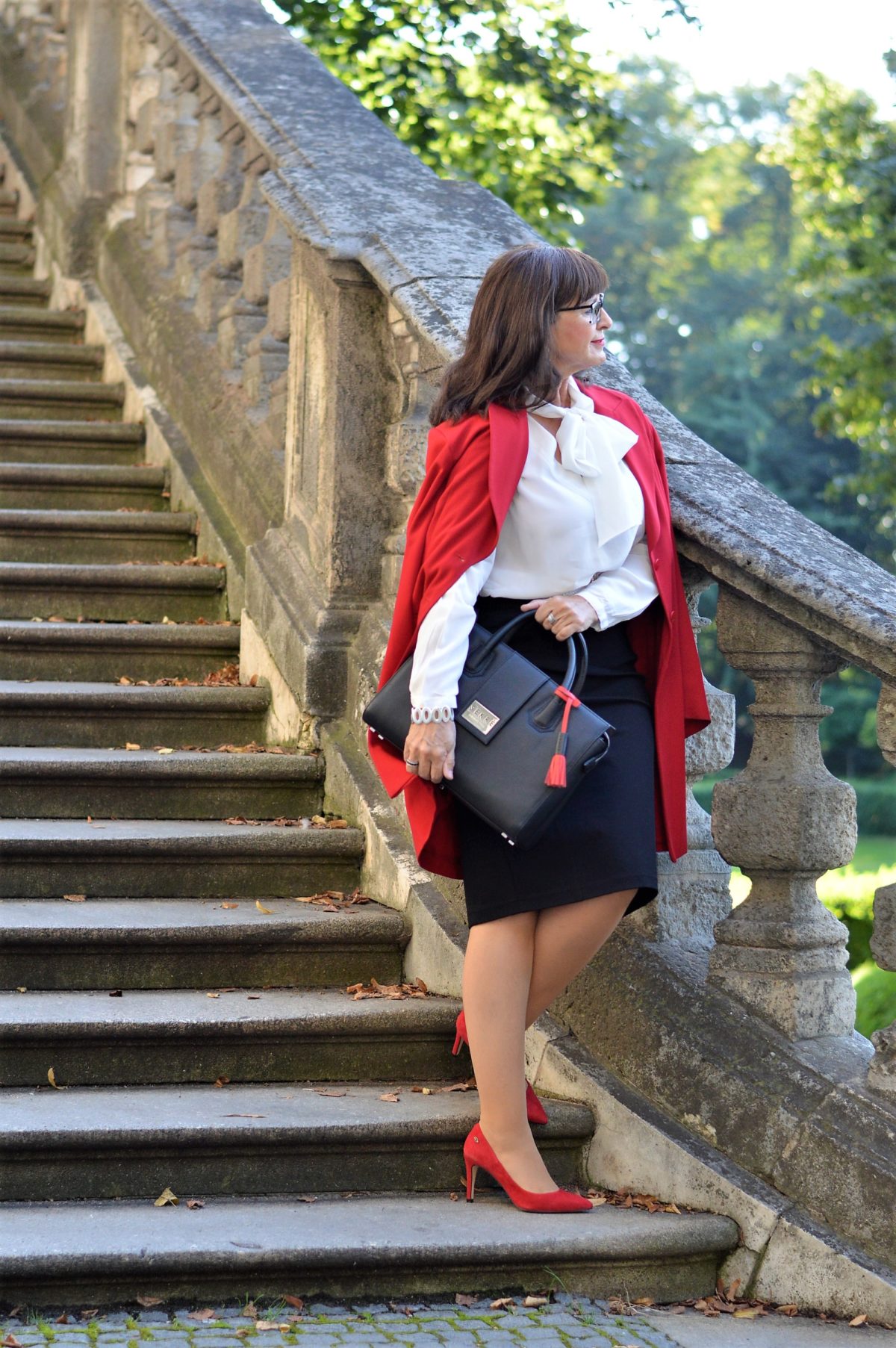 Ohne Mantel geht im Herbst nichts mehr. Der rote Übergangsmantel rundet das professionelle Business-Outfit ab. Meine Brillen trage ich zur Zeit wieder häufiger. Ich habe so einige Brillen zur Auswahl, die ich immer auf meinen Look abstimme. Heute habe ich mich für die schwarz-weiße Brille entschieden – passt so schön zu Rock und Bluse.
