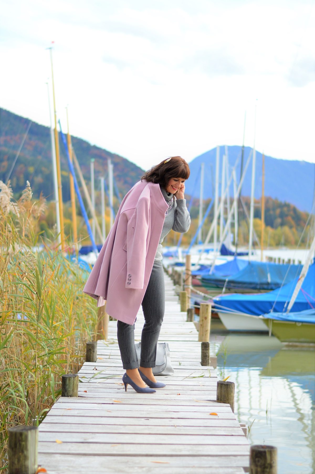 Zu meiner grauen Businesshose kombiniere ich einen schicken Wollmantel in rosè. Ich weiß, dass diese Farbe Harmonie signalisiert. Also, warum nicht einmal die Wirkung der Farbe ausnutzen. Und wenn ich den Termin gut überstanden habe, belohne ich mich mit einem kleinen Ausflug an den Tegernsee.