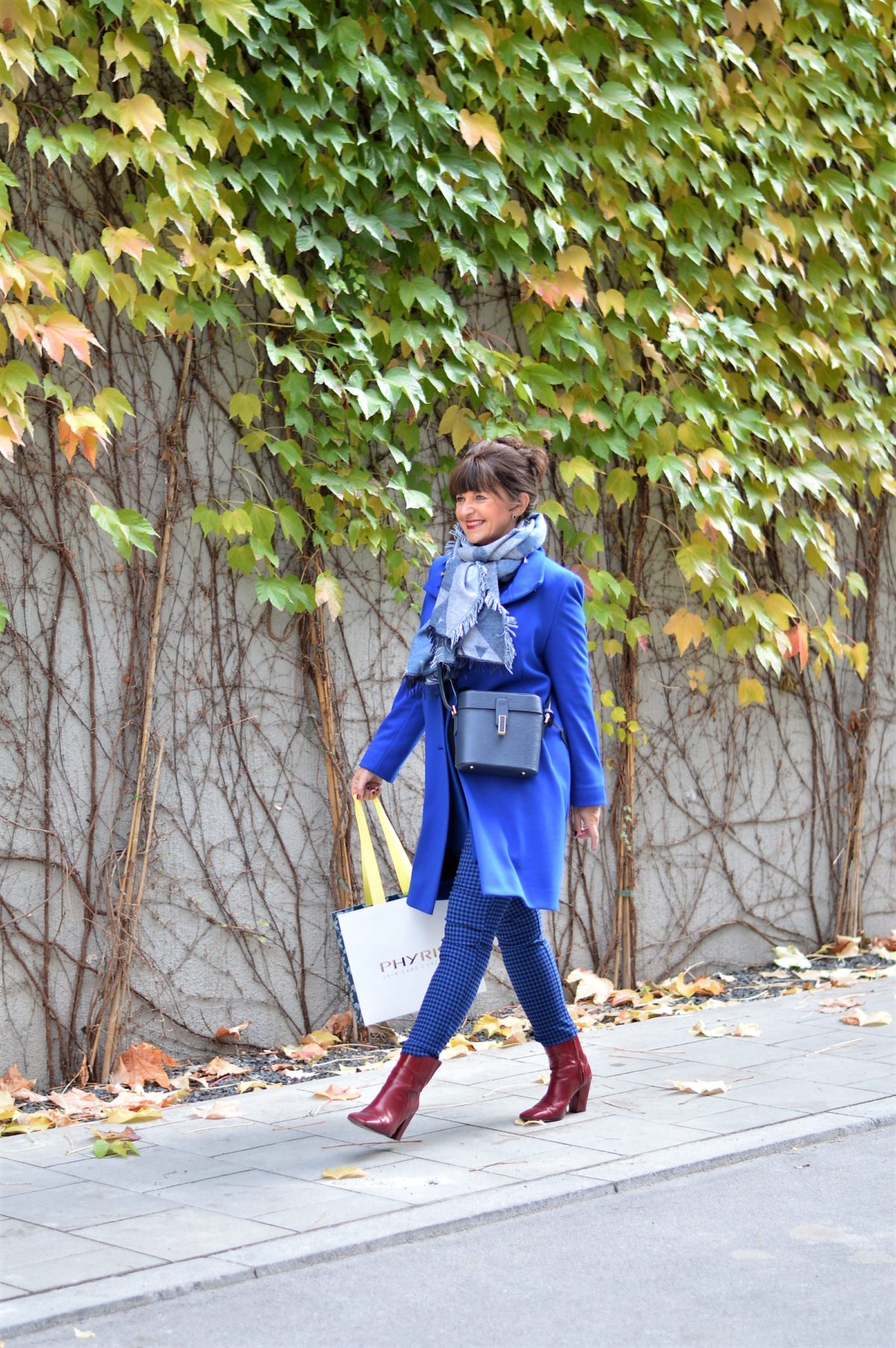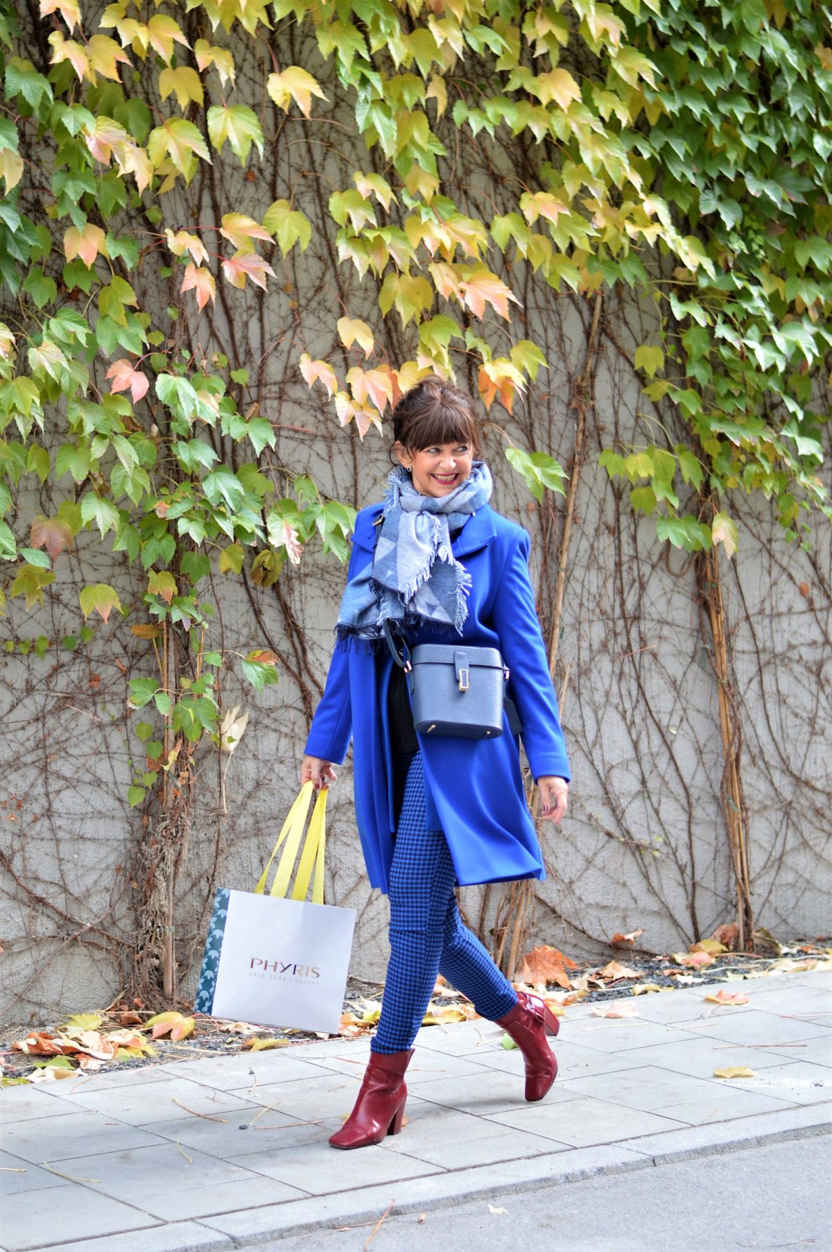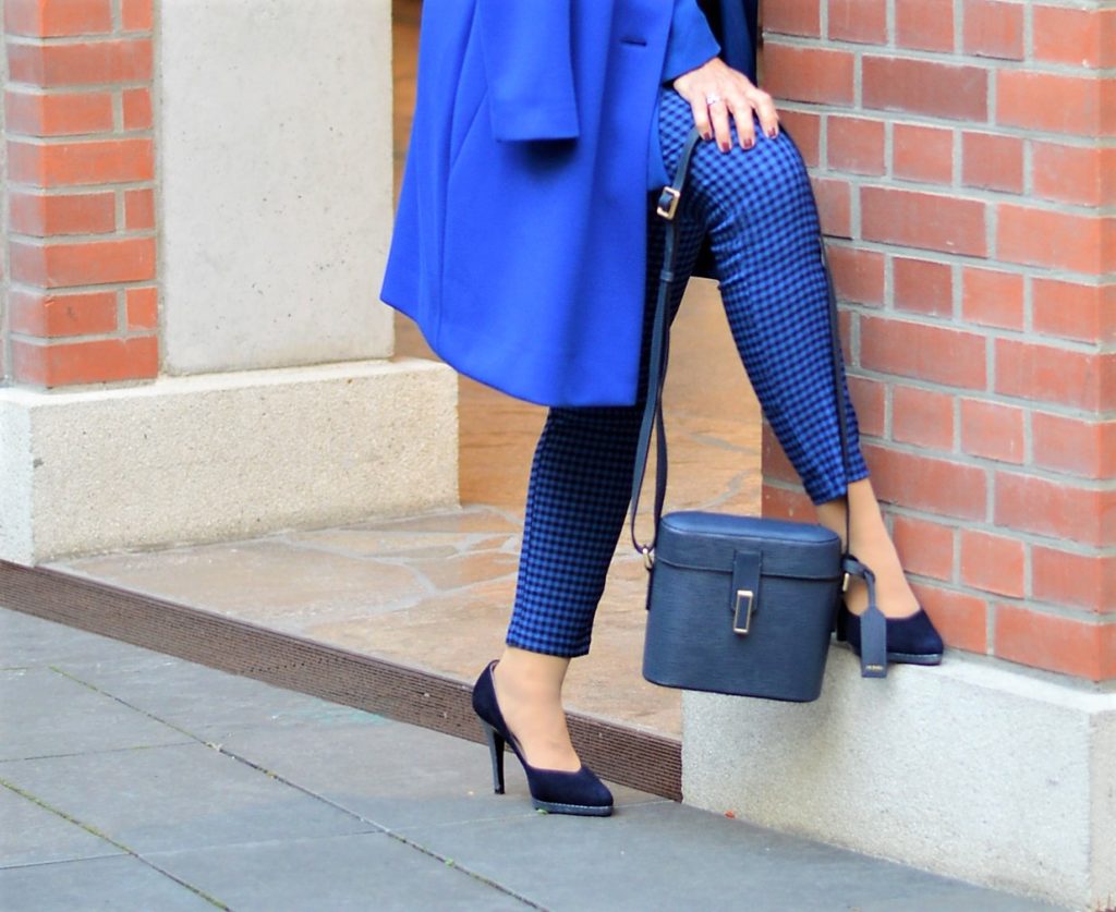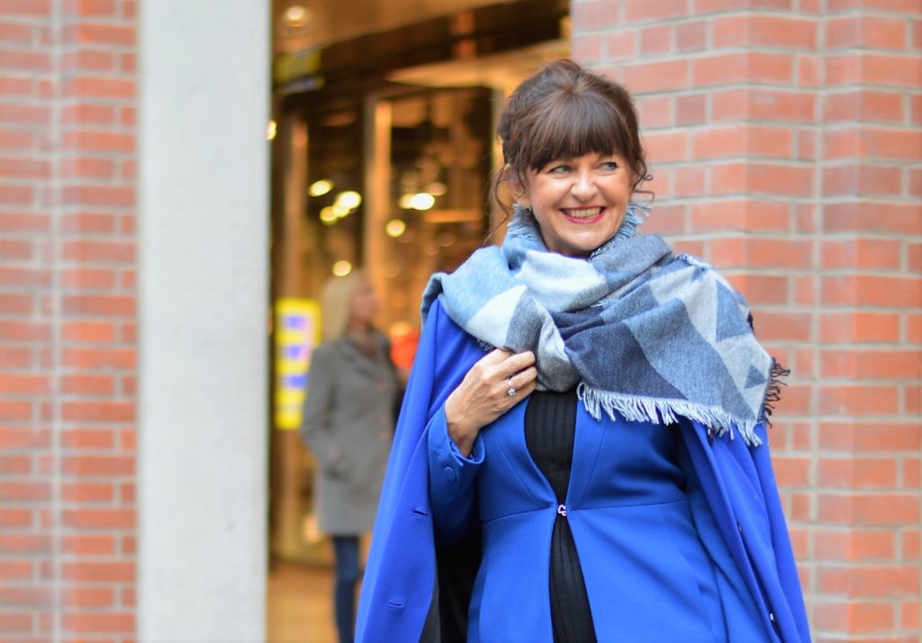 Der Mantel von BETTY BARCLAY rundet den Look perfekt ab. Passend zur Jahreszeit kommt der kuschelige Schal in verschiedenen Blautönen zum Einsatz. Die zauberhafte Handtasche von PICARD trage ich zur Shopping-Tour am liebsten Cross-Body. Da habe ich beide Hände frei. Die passenden Pumps sind ebenfalls in Blau-Tönen gewählt.