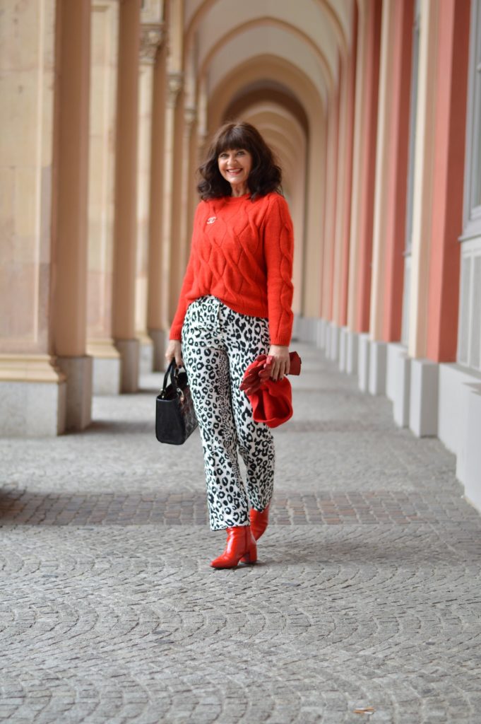 Der Strickpulli in rot mit der schwarz-weißen Leohose ist mein Favorit zum Thema Animalprint. Ich trage die Hose auch gerne mit einem schwarzen Blazer oder einem schwarzen Oversize Pullover.