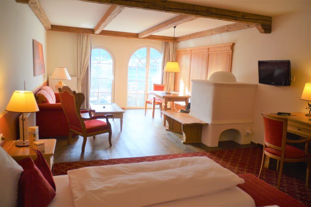 Sehr herzlich wird man im Ebner’s Waldhof empfangen. Herzlichkeit, die von Herzen kommt. Ein großzügiges Doppel-Zimmer im Hotelbereich „Ansitz“ ist für mich vorgesehen. Zauberhaft mit rotem Teppichboden und gemütliche Atmosphäre macht es mir ganz einfach, mich auf Anhieb wohl fühlen. Der Blick aus dem Zimmer war direkt auf den traumhaften Fuschlsee und auf die Bergregion.