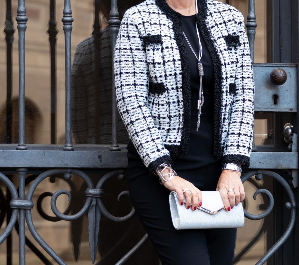 Die Kombination mit einer kurzen Boucle-Jacke ist die perfekte Ergänzung für einen festlichen Einteiler. Durch die kürzere Jacke wirkt die Silohouette vorteilhaft. Sollte der Hüftbereich breiter sein, kann eine längere Jacke oder ein Blazer die Proportionen optisch ausgleichen. Meine schwarz-weiße Jacke hat einen kleinen Hauch von Chanel. Ich trage sie zu vielen anderen Looks wie zum Beispiel einen schwarzen Bleistiftrock und sogar zur Jeans. Bestimmt werdet ihr demnächst diese tolle Jacke noch häufiger sehen.
