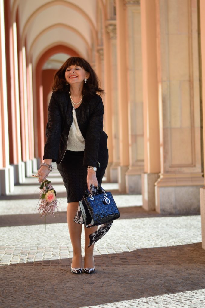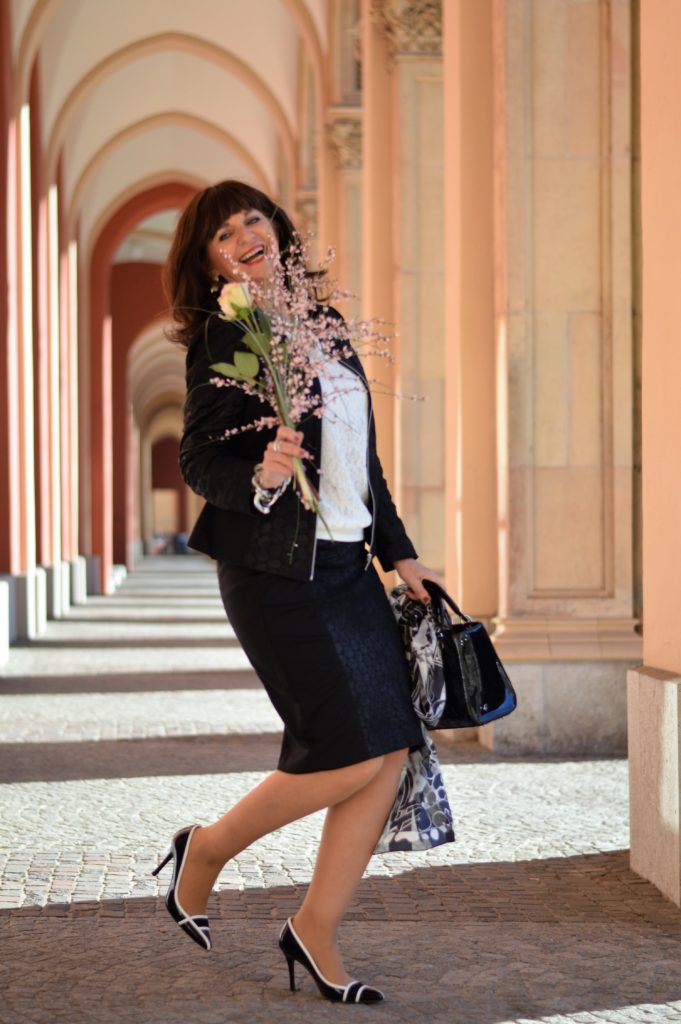 Zusammen getragen ergibt sich ein modisches Kostüm daraus. Einzeln lässt sich der modische Blazer zu anderen Röcken, Kleidern oder Hosen kombinieren. Der feminine Rock mit Lederimitat ist an den Seiten mit elastischen Einsätzen verarbeitet. Das schmeichelt der Figur und bringt die weibliche Proportion vorteilhaft zur Geltung. Ein schwarzer Bleistiftrock ist so vielseitig einsetzbar, dass ich sogar darüber bereits einen Blog-Beitrag mit 5 verschiedenen Looks zusammen gestellt habe – HIER anklicken und weitere Inspirationen anschauen.