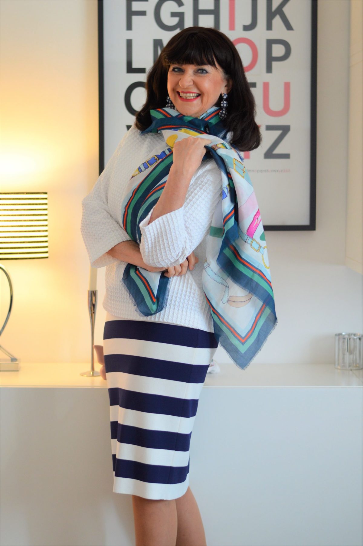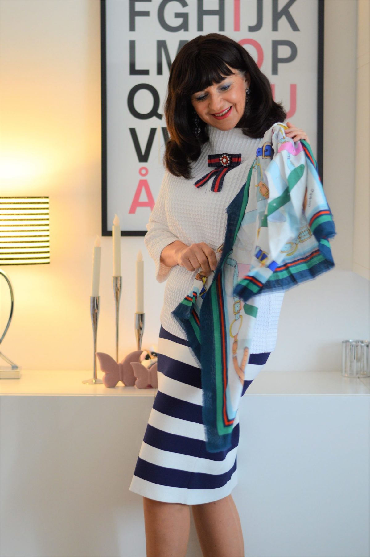 Den Strickrock habe ich euch schon einmal in der beliebten Serie – 1 Teil – 5 Looks – vorgestellt. HIER anklicken. Der Strickrock sieht nicht nur toll aus, er ist vor allem bequem. Gerade wenn ich sehr lange am PC sitze ist er nicht spürbar. Eine schöne Brosche nicht vergessen. Heute finde ich besonders ein farbiges großes Tuch von CODELLO so schön. Es gibt zur Zeit bei CODELLO 15 % Rabatt mit dem Rabattcode martina15 – falls Du so gerne Tücher trägst wie ich.