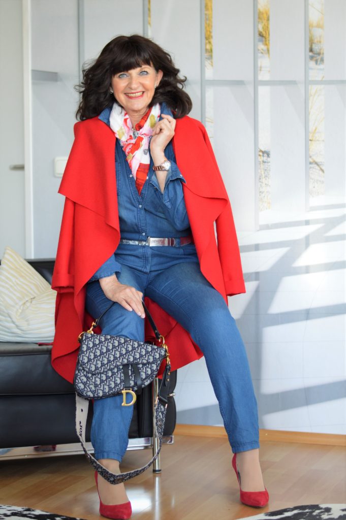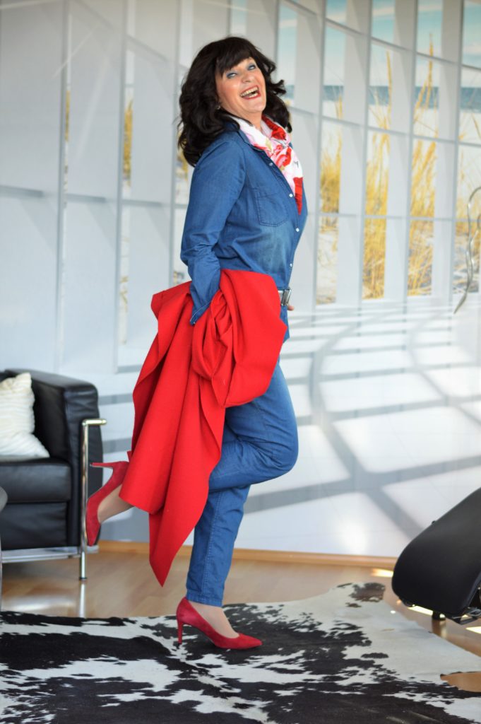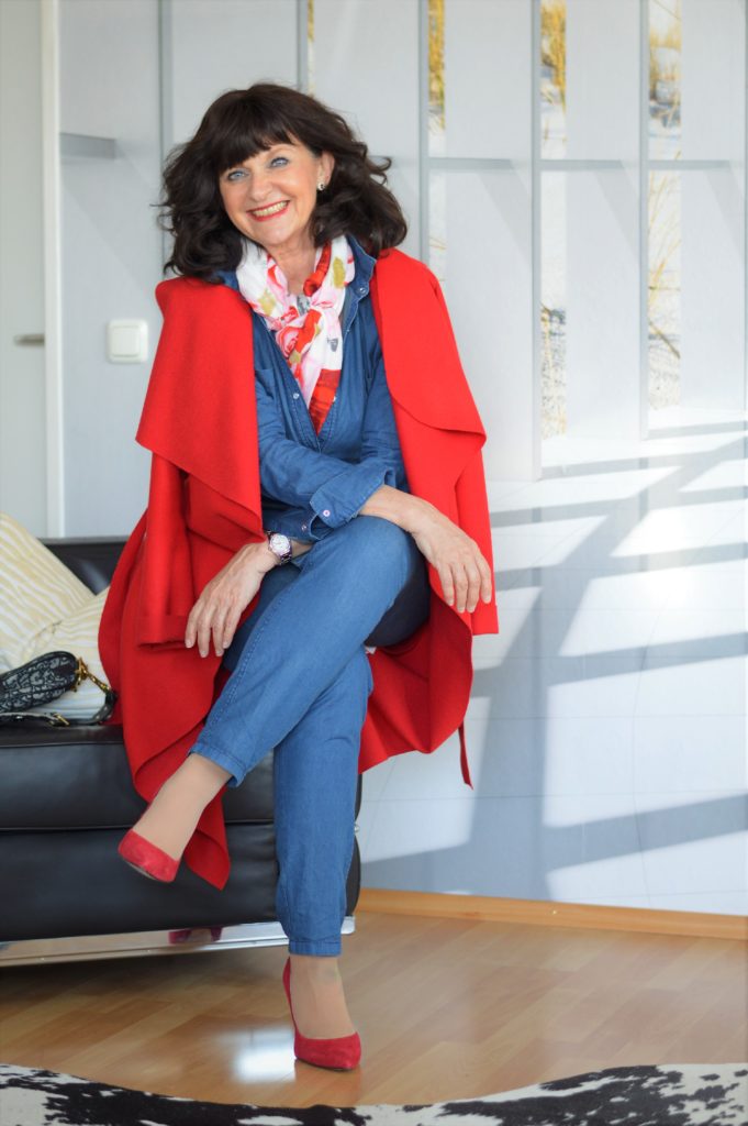 Unter den Jumpsuit kombiniere ich ein rotes Shirt. Rot ist die Farbe die bekanntlich für Power steht. Da ist genau das richtige für ein Home Office Outfit. Darüber kombiniere ich meinen roten Strickmantel. Gerade wenn ich eine Pause mache und mich auf den Balkon setze kann ich die Sonnenstrahlen während der Tee-Pause genießen. Wichtig! Auch im Home Office sollten wir regelmäßige Pausen einlegen.