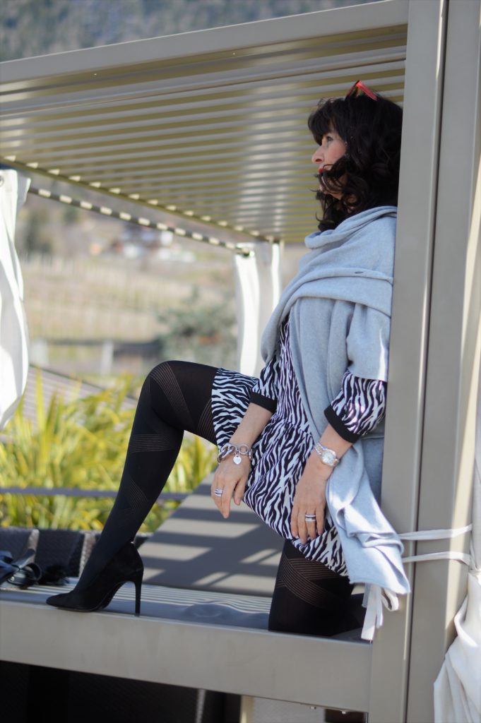 Das Kleid und die Strumpfhose habe ich mir gekauft, als ich zum letzten Mal in Meran war. Als alles noch in Ordnung zu sein schien. Unbeschwert und leicht habe ich diesen Look kombiniert. Natürlich lässt sich eine normale hautfarbene Strumpfhose genauso gut dazu kombinieren. Das ist mir zu normal für den Look. Heute wollte ich einfach mal ganz anders aussehen. Euch zeigen, dass wir Frauen 50plus durchaus nochmal zum Hingucker werden können. MUT TUT GUT!