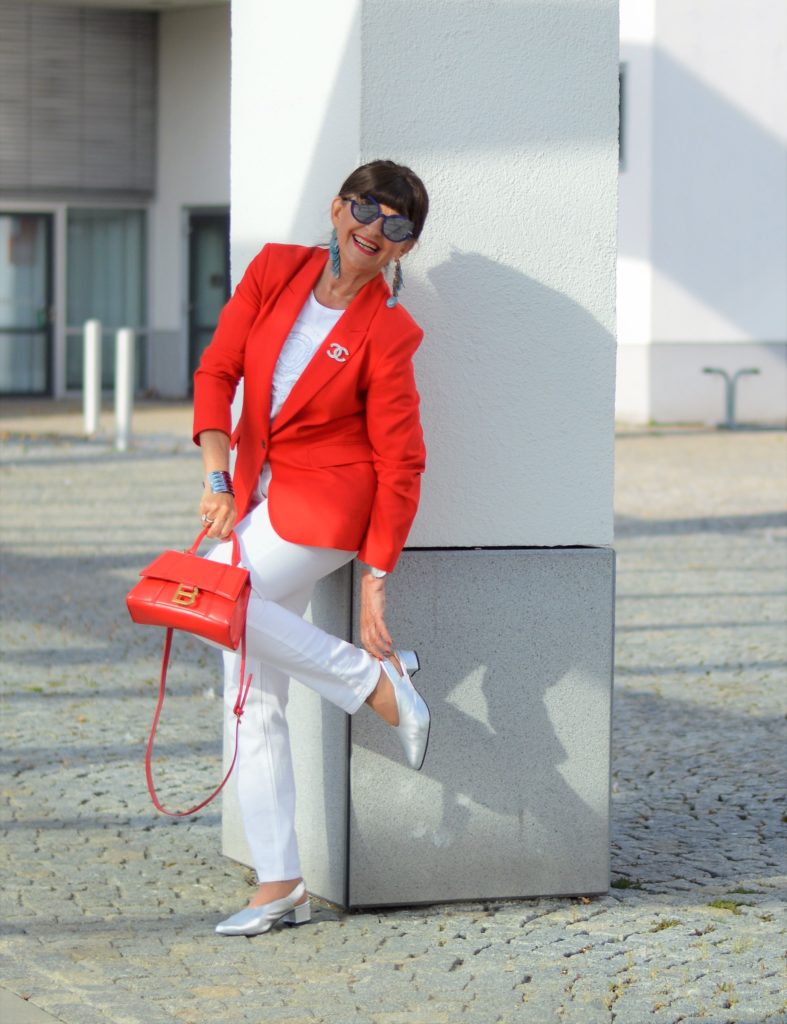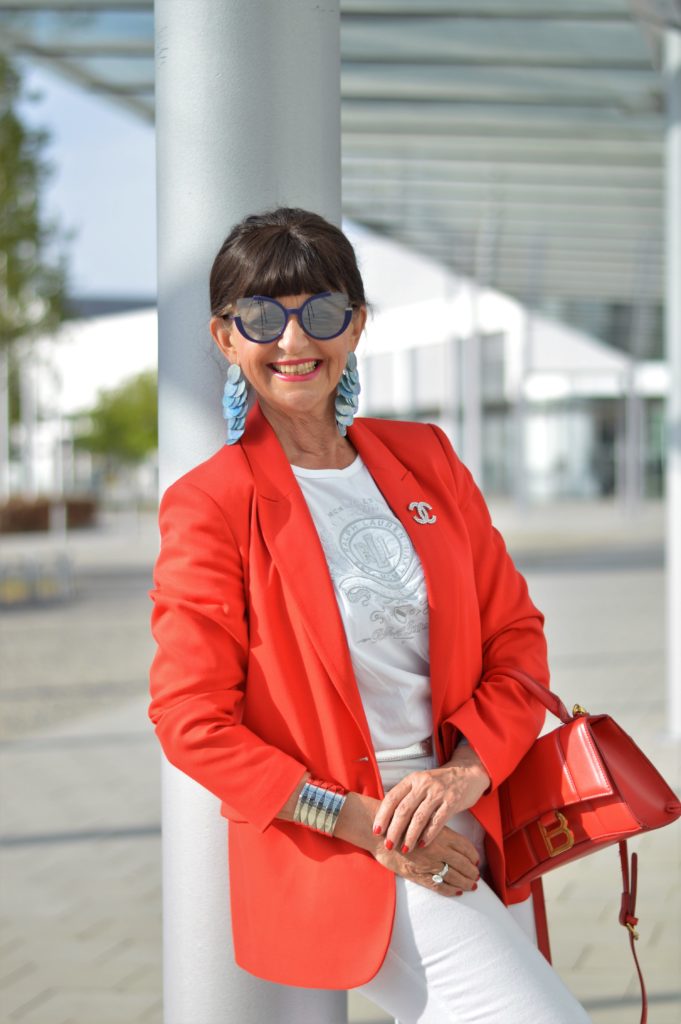 Rot und weiß, wie frisch und lebendig diese Kombination aussieht und wirkt. Zur Zeit stehe ich extrem auf weiße Hosen, ob Jeans oder Stoffhose ist egal. Hauptsache weiß. Mit allen kräftigen Farben wirkt weiß noch intensiver. Der rote Blazer ist Teil meines roten Hosenanzugs. Unter dem Blazer trage ich ein weißes Shirt mit Stickerei. Eine gute Alternative zur Bluse. Eines darf definitiv nicht fehlen: Die stylische Sonnenbrille.