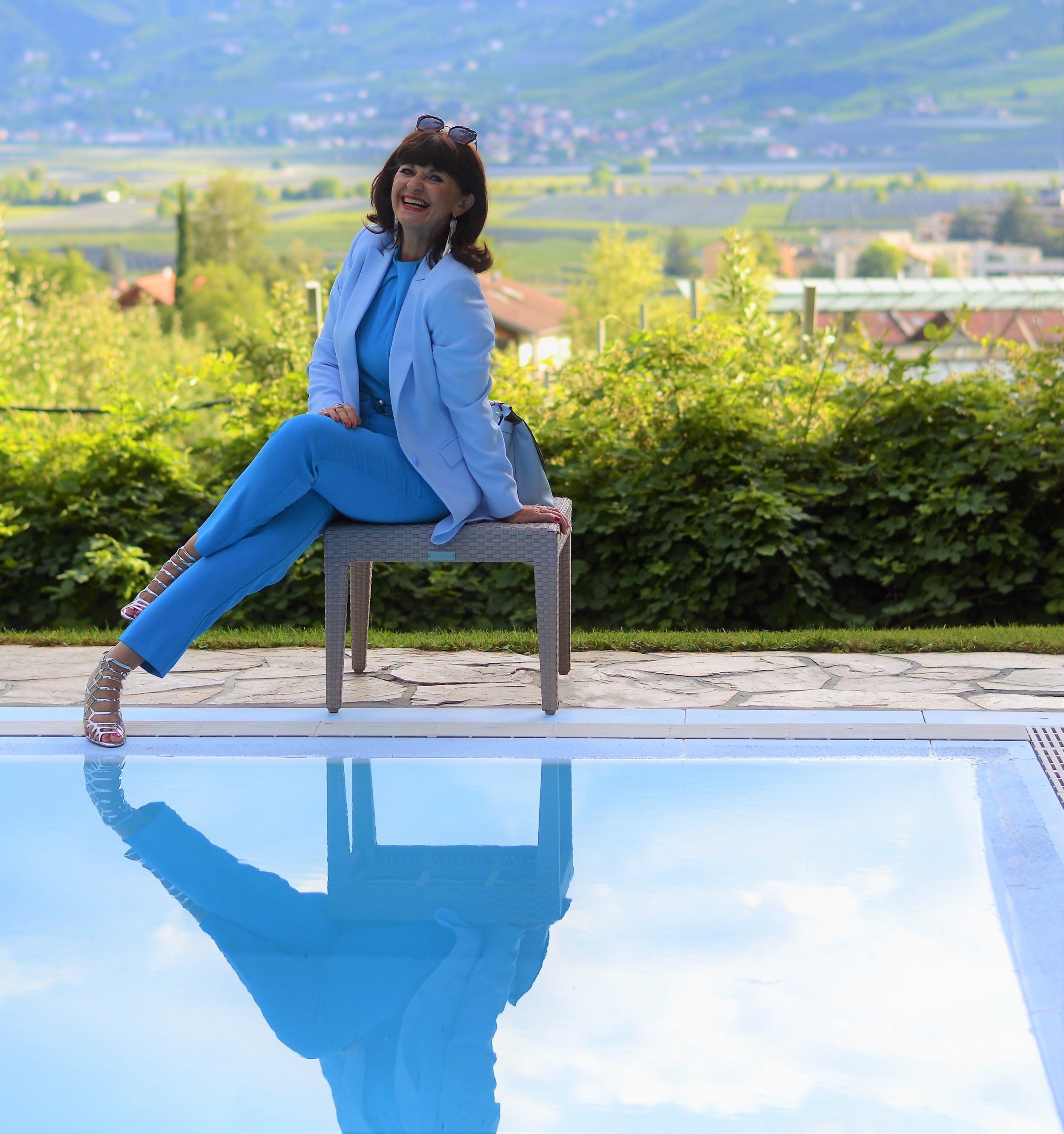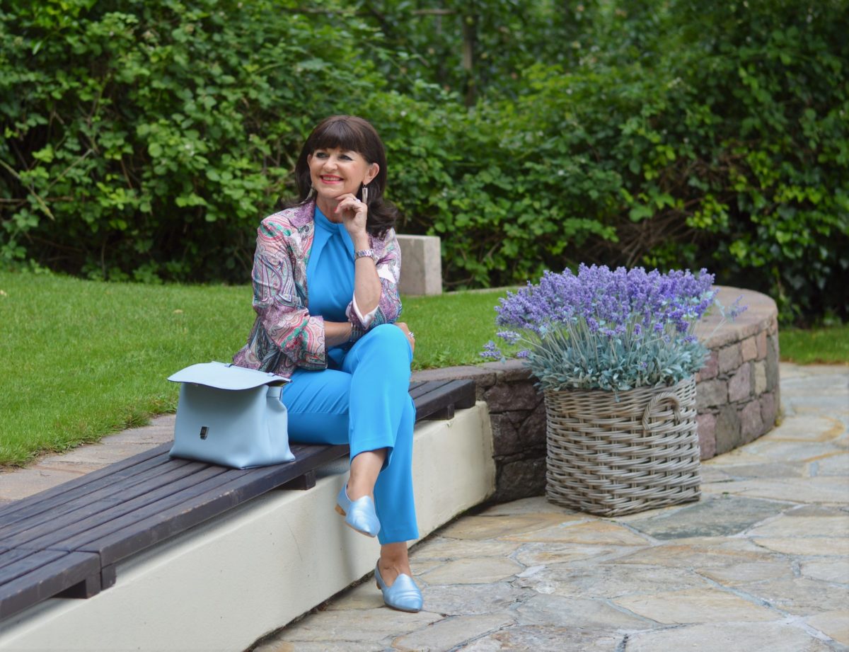 Mein persönlicher Favorit ist der hellblaue Blazer zum Jumpsuit. Das war mein Outfit, als ich mein Geburtstagsdinner in Meran auf der tollen Terrasse im Freien genießen konnte. Geht es formeller zu, sind silberne Clutch und passende Highheels meine Accessoires zum Einteiler. Der Ton-in-Ton Charakter lässt das ganze Styling sehr edel wirken.