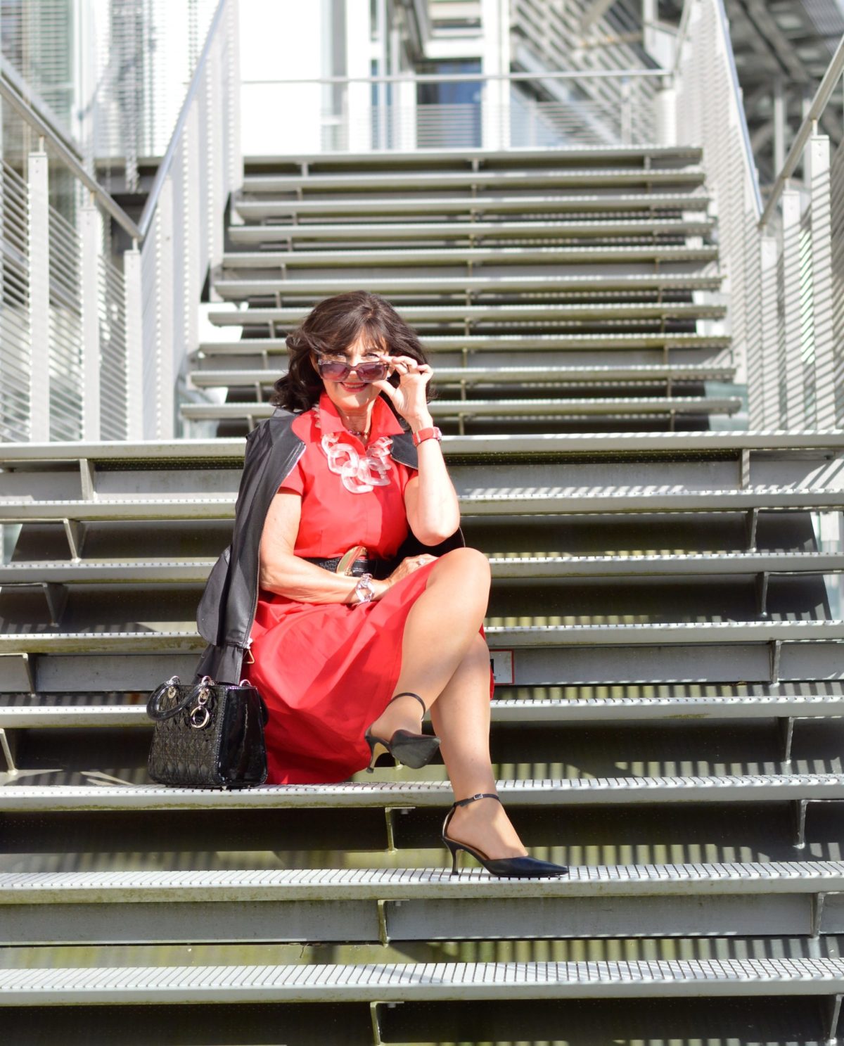Wer Kleider gerne mit einer Lederjacke kombiniert, für diese Ladys zeige ich euch die zweite Kombimöglichkeit für ein rotes Kleid. Eine schwarze Lederjacke hat – glaube ich – jede von uns im Kleiderschrank. Meine Lederjacke ist mit leichten Volants am Saum und an den Ärmeln gearbeitet. Damit wird der feminine Touch unterstrichen und die Jacke wirkt nicht zu burschikos. Die weiße Tasche tausche ich gegen eine schicke kleine schwarze Tasche.