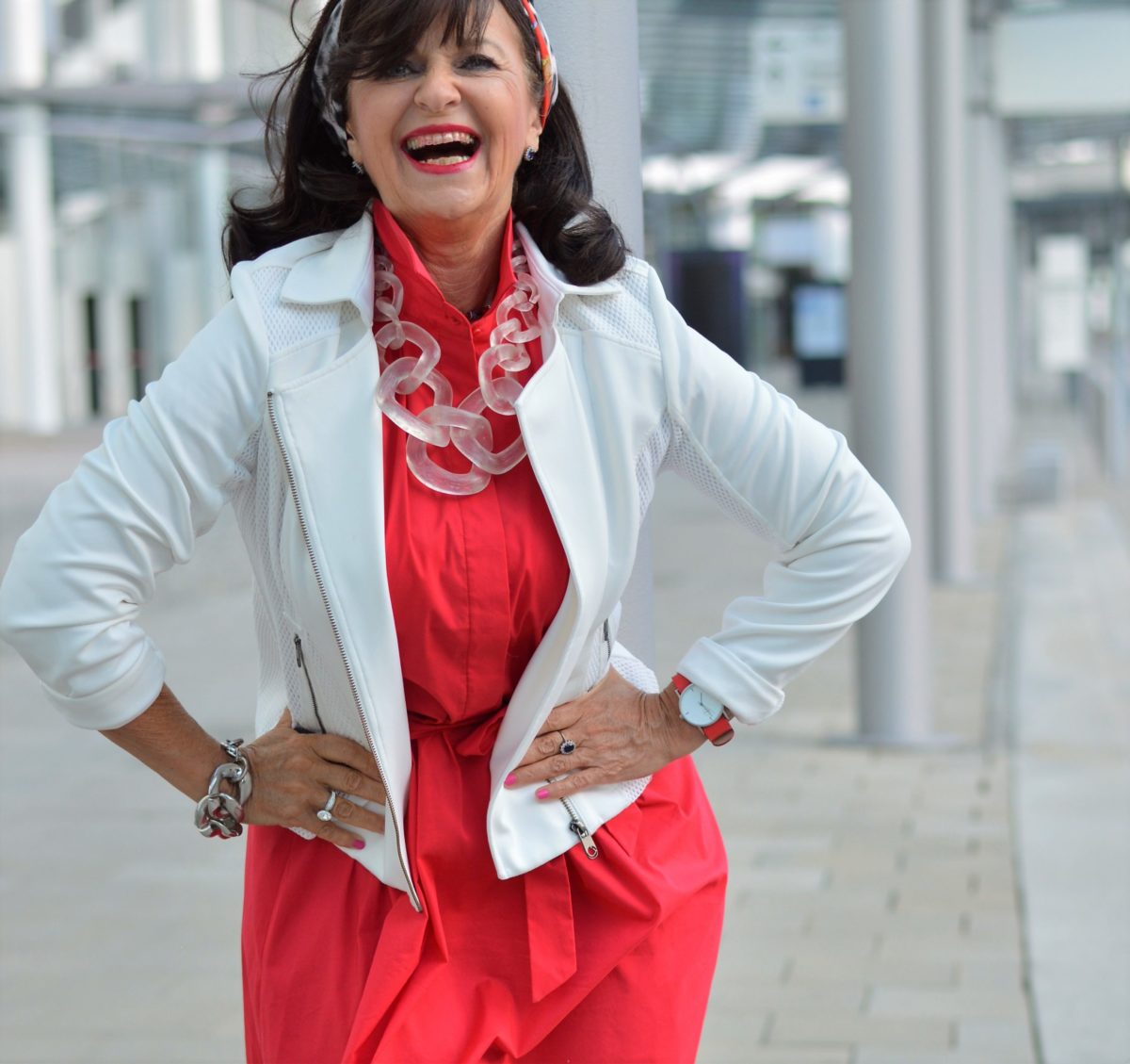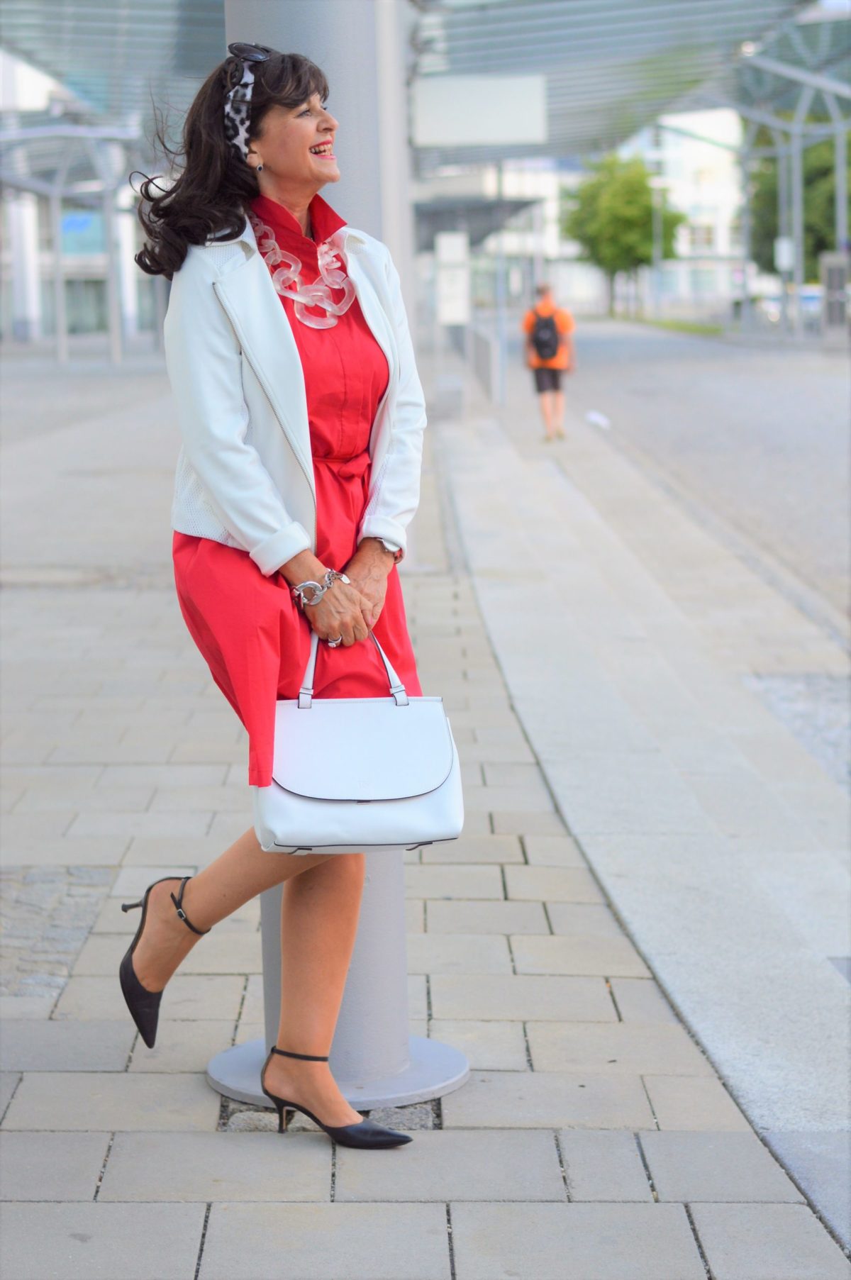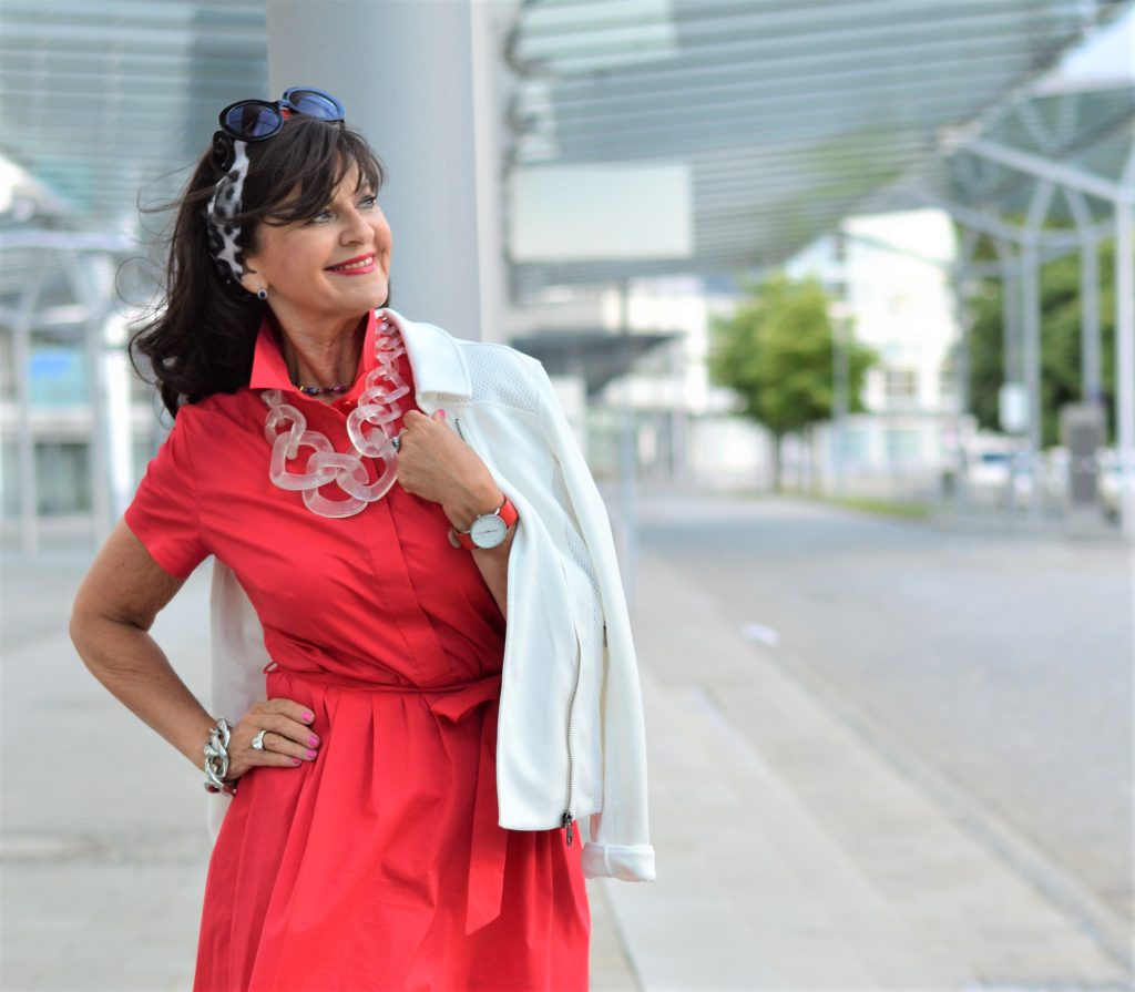 Mein rotes Kleid kombiniere ich im heutigen Beitrag mit einer weißen Biker-Jacke. Das gibt dem roten Kleid einen leichten lässigeren Look. Eine weiße Handtasche passt im Sommer zu jedem Look, egal welcher Anlass gerade ansteht. Besonders gefällt mir die große Gliederkette. Eine außergewöhnliche Kette, die viele Bewunderer hat. Ich weiß noch genau wo ich sie gekauft habe, und zwar in Lindau am Bodensee in einem etwas „vielseitigen“ Laden.