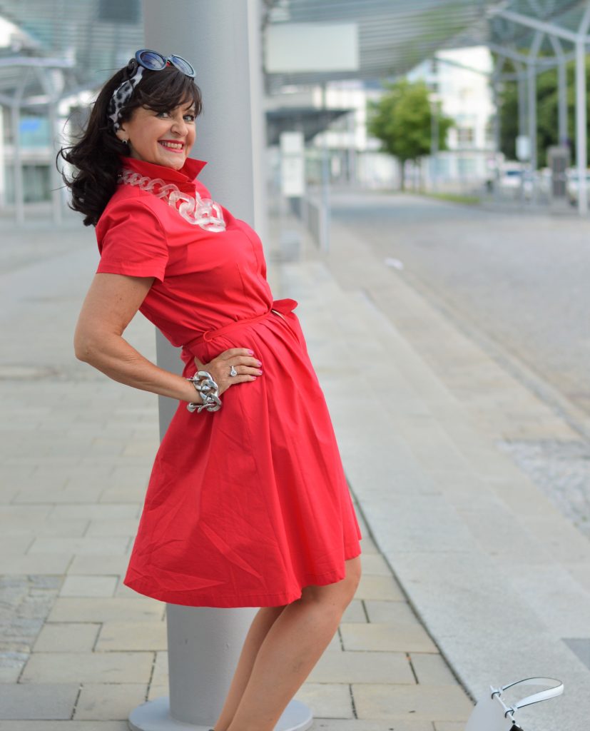 Also, Kleiderschrank auf und mal etwas tiefer hinein geschaut. Siehe da, ich entdecke mein schönes rotes Hemdblusenkleid, welches ich fast schon vergessen hätte. Mir geht es oft so, dass ich im Schaufenster oder in Magazinen Outfits sehe, die mich daran erinnern, dass ich so etwas selbst im Schrank habe. Mit diesem roten Kleid wird ein Sommertag zum Powerday.