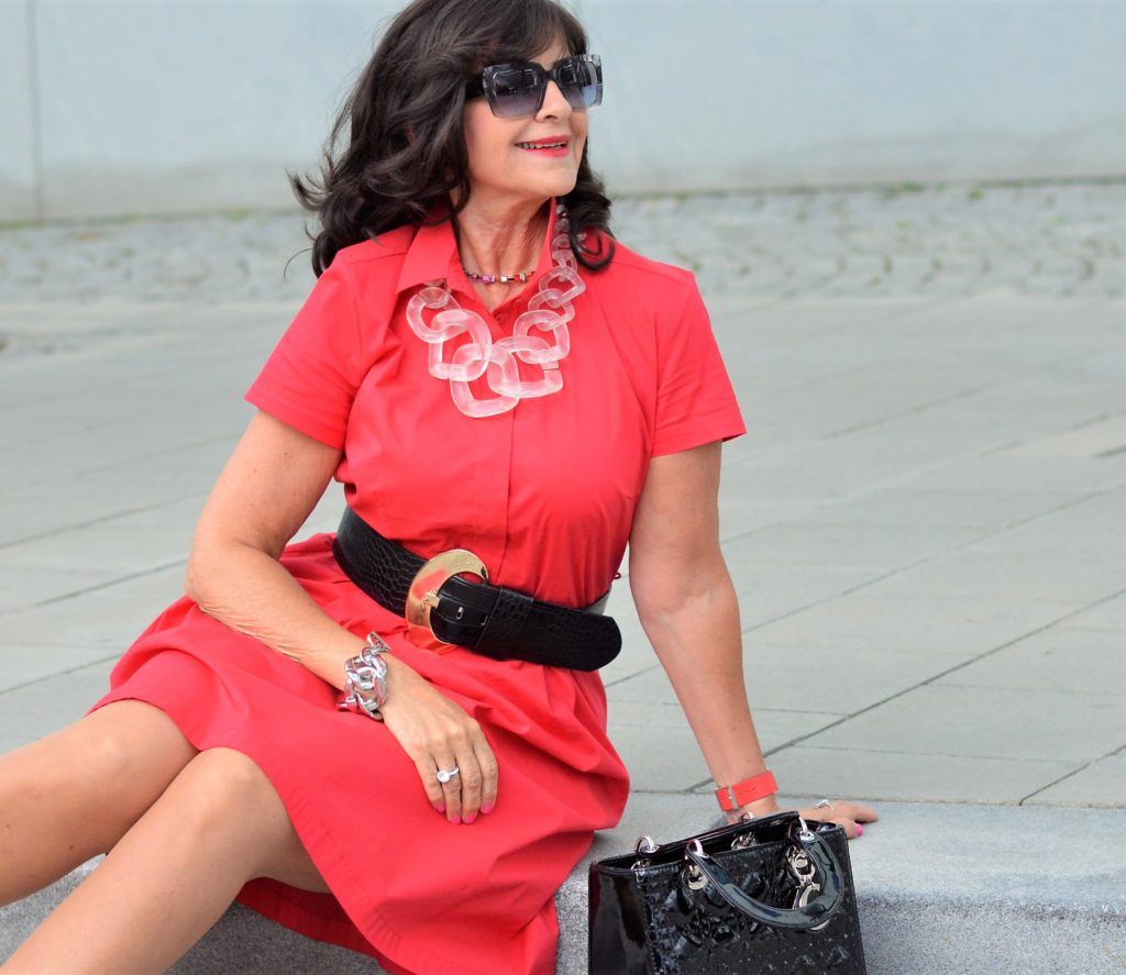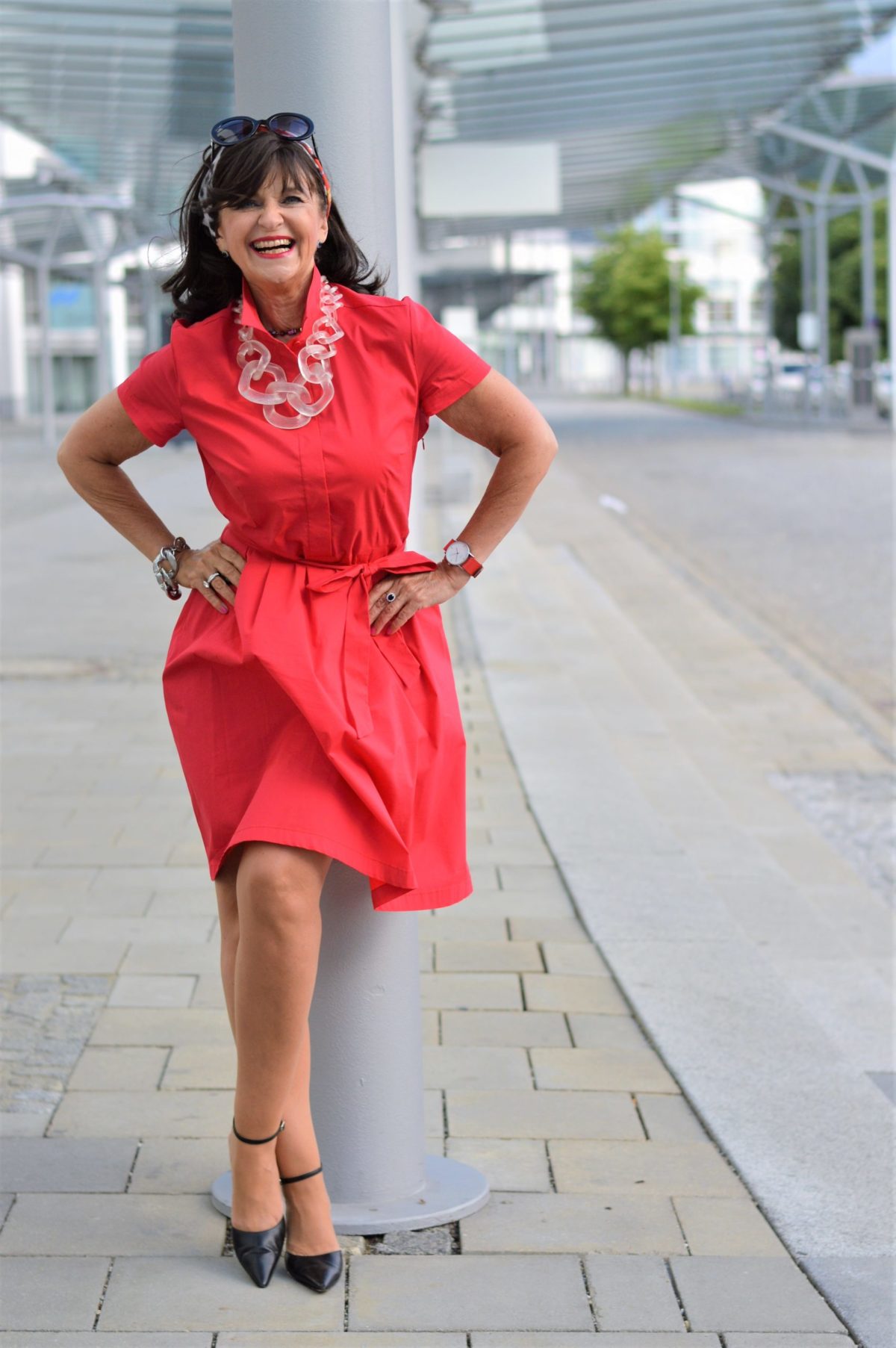 das rote Hemdblusenkleid gefällt mir sehr gut. Ob mit weißer oder schwarzer Jacke, es ist auf jedenfall ein Hingucker. Und mit den gut gewählten Accessoires ein Look der mit Sicherheit auffällt.