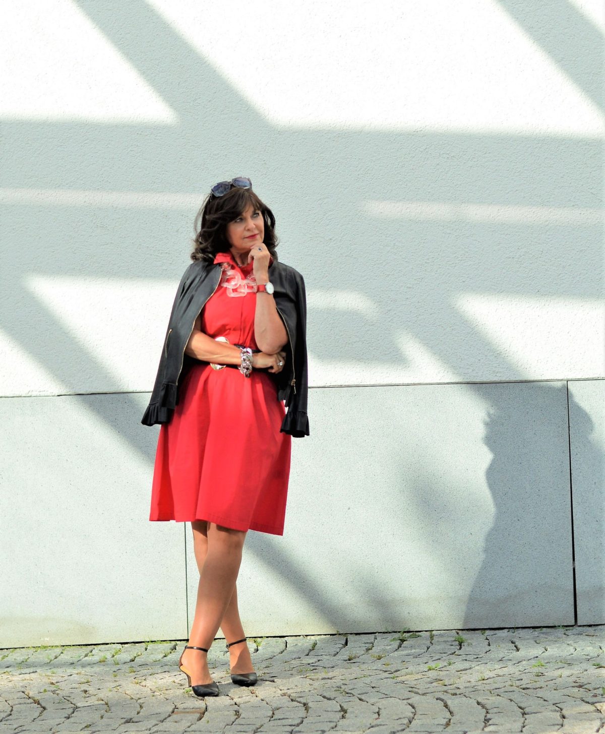 Wer Kleider gerne mit einer Lederjacke kombiniert, für diese Ladys zeige ich euch die zweite Kombimöglichkeit für ein rotes Kleid. Eine schwarze Lederjacke hat – glaube ich – jede von uns im Kleiderschrank. Meine Lederjacke ist mit leichten Volants am Saum und an den Ärmeln gearbeitet. Damit wird der feminine Touch unterstrichen und die Jacke wirkt nicht zu burschikos. Die weiße Tasche tausche ich gegen eine schicke kleine schwarze Tasche.