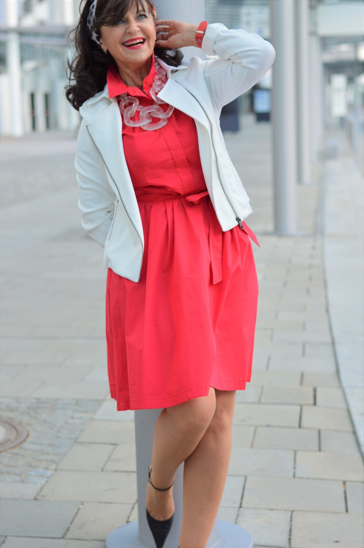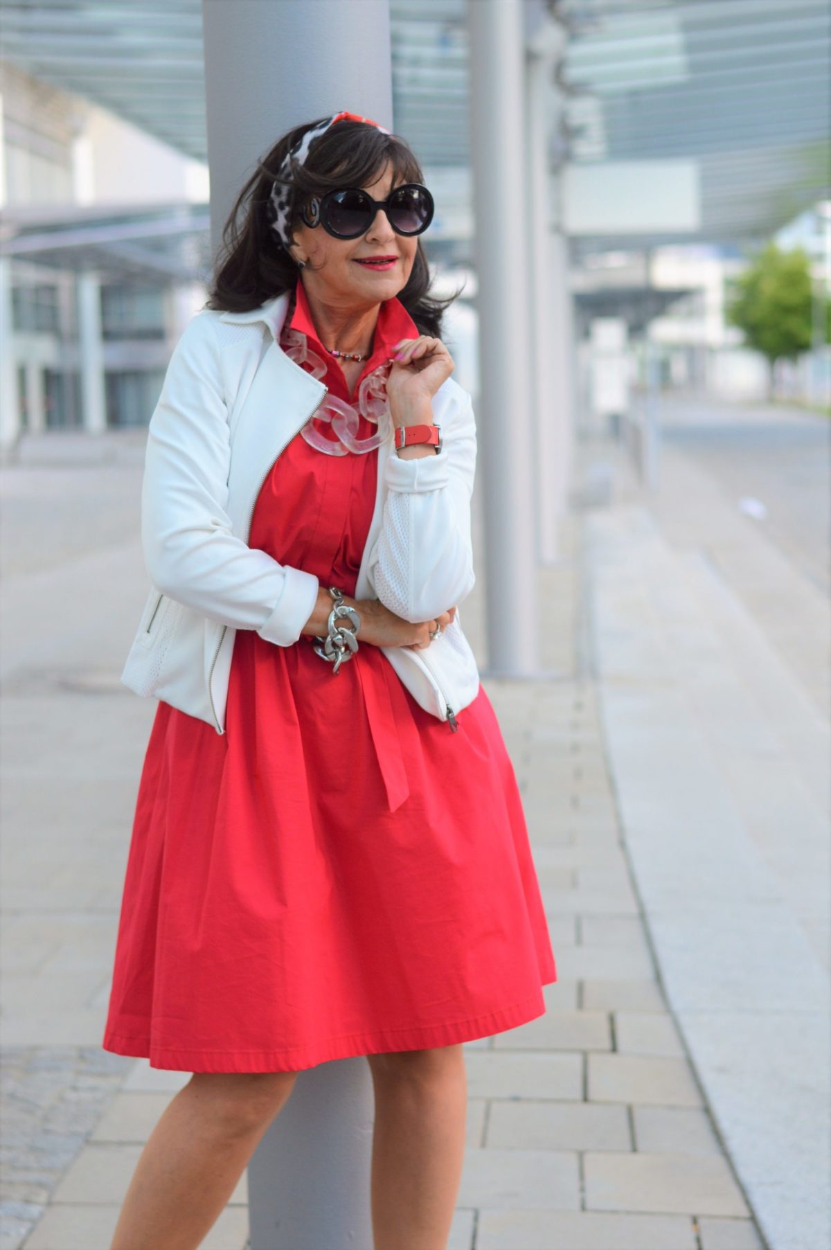 Mein rotes Kleid kombiniere ich im heutigen Beitrag mit einer weißen Biker-Jacke. Das gibt dem roten Kleid einen leichten lässigeren Look. Eine weiße Handtasche passt im Sommer zu jedem Look, egal welcher Anlass gerade ansteht. Besonders gefällt mir die große Gliederkette. Eine außergewöhnliche Kette, die viele Bewunderer hat. Ich weiß noch genau wo ich sie gekauft habe, und zwar in Lindau am Bodensee in einem etwas „vielseitigen“ Laden.