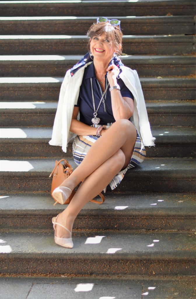 Der Bleistiftrock mit den Längsstreifen macht sich gut zur weißen Boucle-Jacke und dem dunkelblauen Poloshirt. Diese Kombinationsmöglichkeit ist für mich der perfekte Look, um zu einer Veranstaltung oder zum Essen zu gehen. Stilvoll mit einer gewissen Eleganz wird die Weiblichkeit extrem hervorgehoben. Demnächst gibt es auf INSTAGRAM ein Video zum Rock. So kannst Du Dir vorstellen, welche Wirkung mit diesem Outfit auf Deine Gegenüber erzielt werden kann.