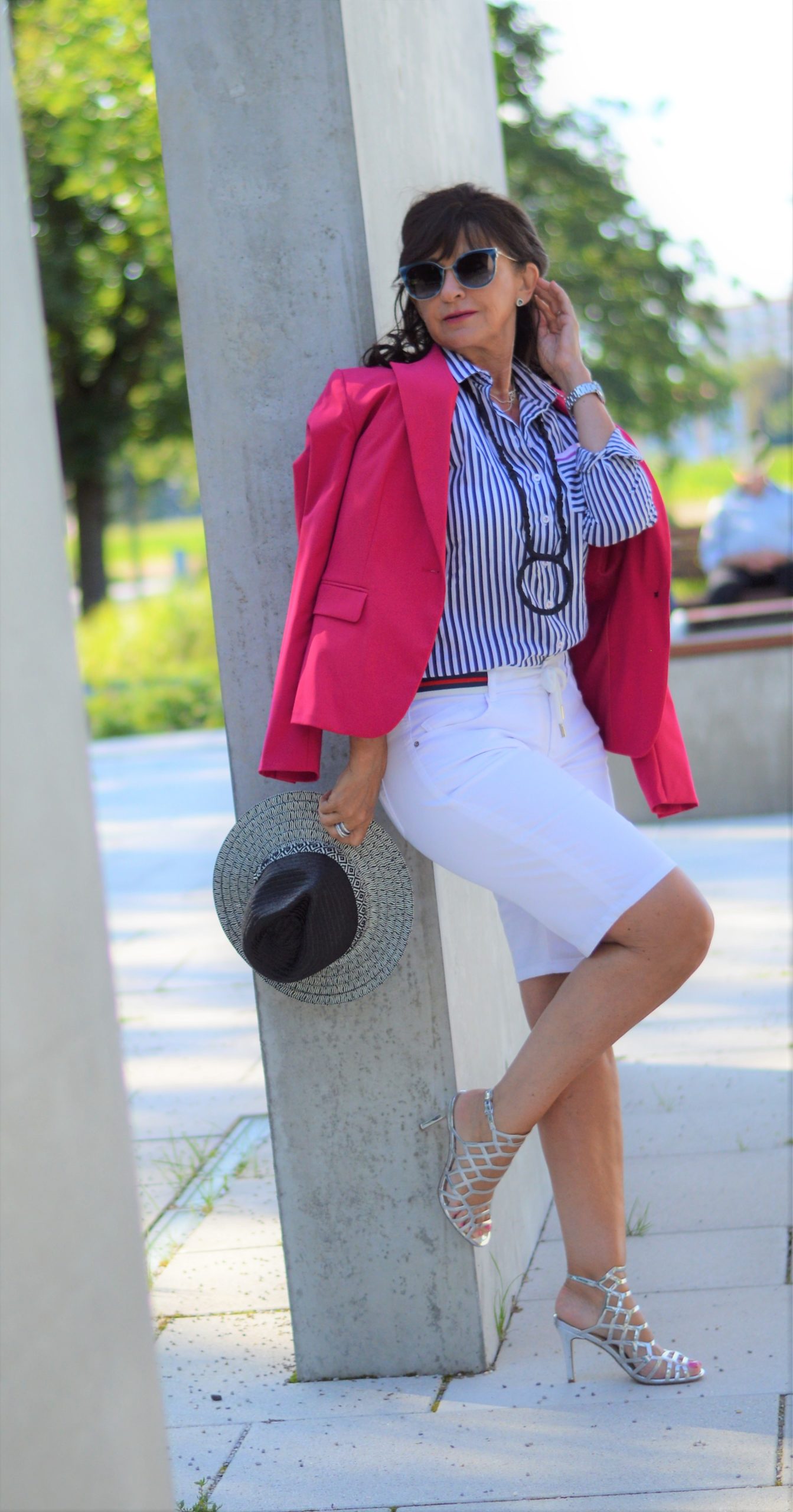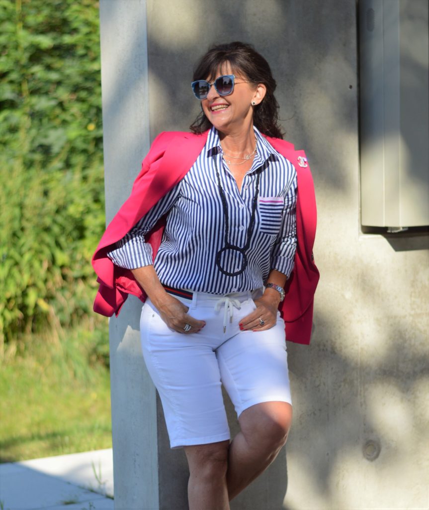 - Als bekennender Blazer-Fan gibt es für mich als besten Kombipartner zur Bermuda den Blazer. Er ist farbenfroh und klassisch in der Schnittführung. Darunter trage ich eine gestreifte leichte Baumwollbluse von Eterna. Wird der Blazer ausgezogen, wirkt der Look immer noch sommerlich und ergänzt durch die Streifen in der Bluse den leichten Maritimen Look.