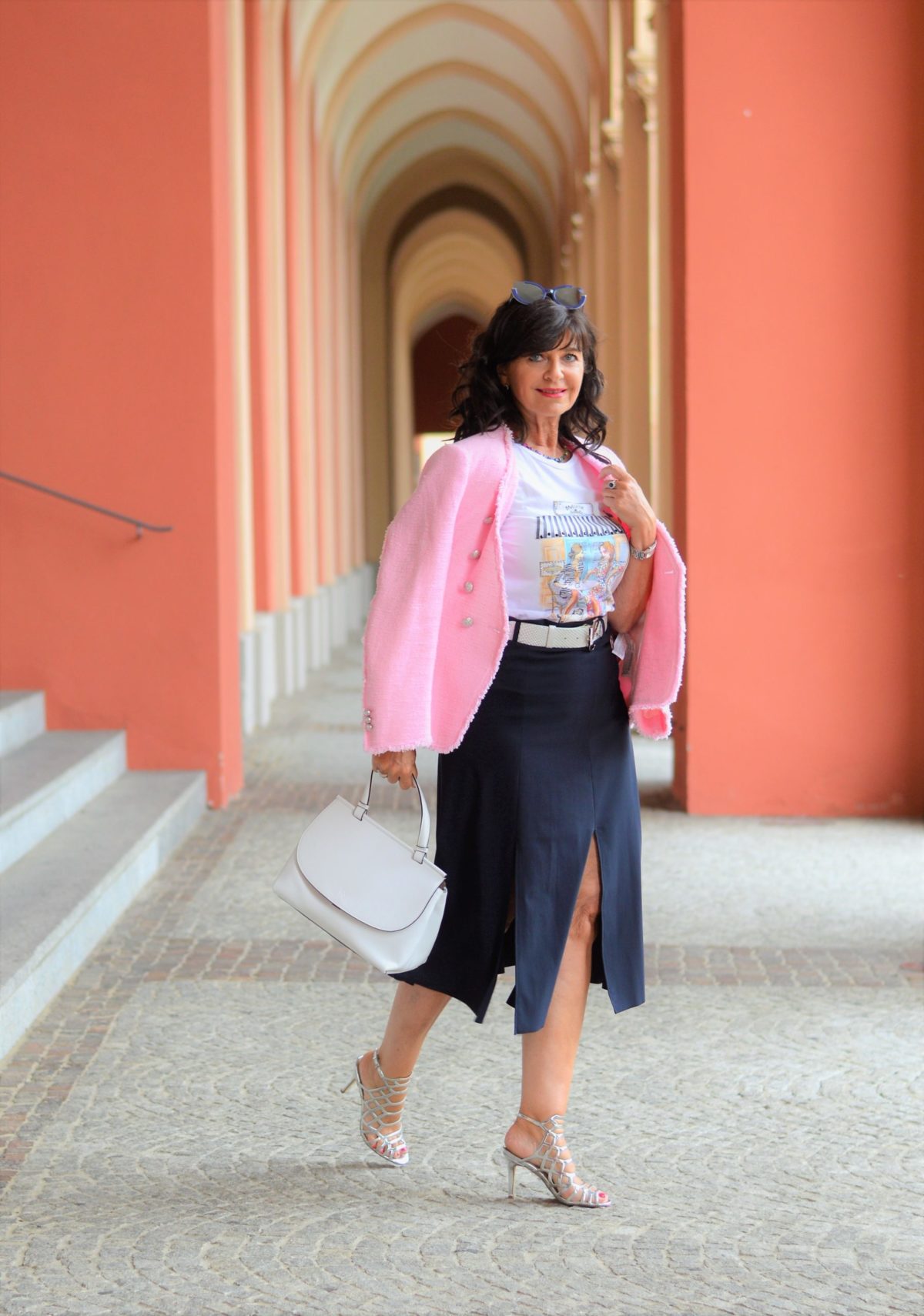 Bei dem rosefarbenen Boucleblazer gefällt mir der Farbton besonders gut. Selbst zum roten Kleid trage ich den Blazer sehr gerne. Das kannst Du rechts oben an meinem Profilbild gut erkennen. Perfekt an dem Blazer ist, dass selbst die Knöpfe in Silber gewählt sind. Daraus ergibt sich, dass die Accessoires dazu passend abgestimmt werden.