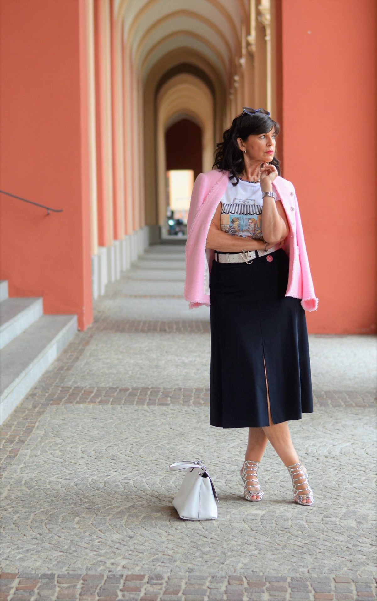 Die erste Kombination: Die Bluse habe ich gegen ein Statement-Shirt eingetauscht. Ein gewagter Print befindet sich auf dem Shirt, welches ich in Erlangen in einer Boutique im letzten Jahr gekauft habe. Gerade in der Übergangszeit ist es mittags ab und an noch schön warm. Da kann man in der Mittagspause die Sonne genießen, den Blazer aus- und die Sonnenbrille dafür anziehen. Schön, wenn die Sonne die Haut ein letztes Mal küsst.