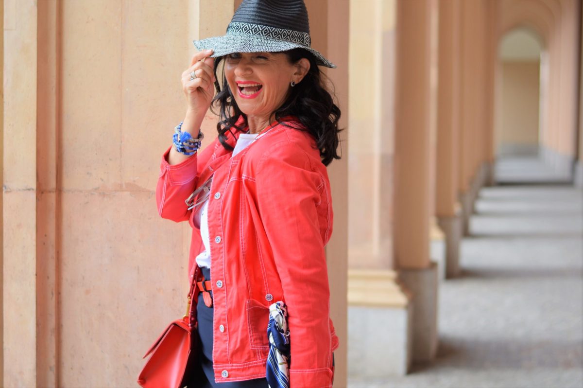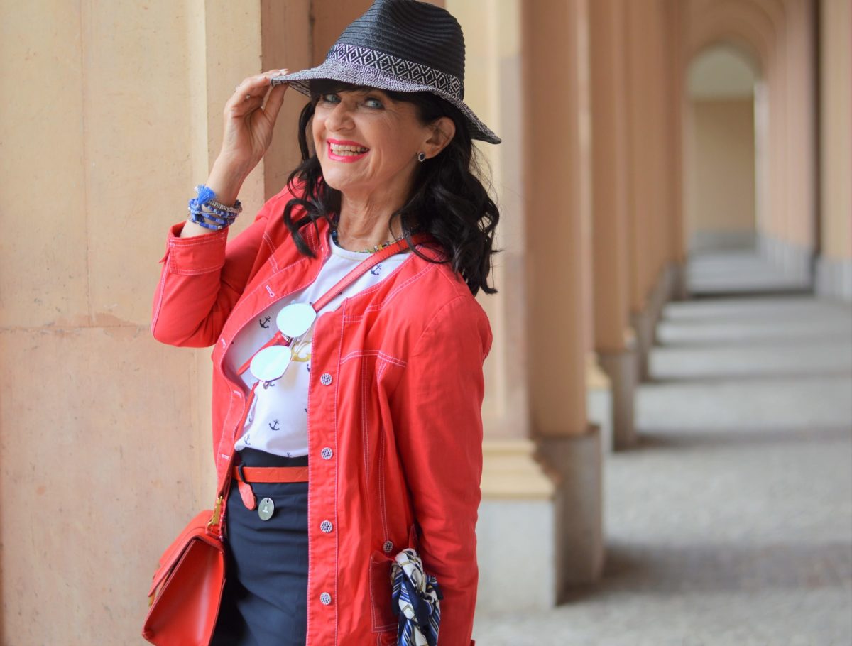 Die zweite Kombination: Für den City-Look greife ich zu der Farbkombination Rot Weiß Blau. Ganz klar, der Maritime Stil spielt dabei die ausschlaggebende Rolle für den Look. Die rote kurze Jacke ist für die Freizeit gedacht. Gerne habe ich sie auf Reisen dabei, vor allem wenn ich auf Kreuzfahrt unterwegs war. Dazu kombiniere ich ein Shirt, welches mit Anker-Motiven verziert ist. Besser kann man den Maritimen Look nicht aufeinander abstimmen. Ein weiterer Styling Tipp ist, ein gestreiftes Shirt dazu zu tragen.