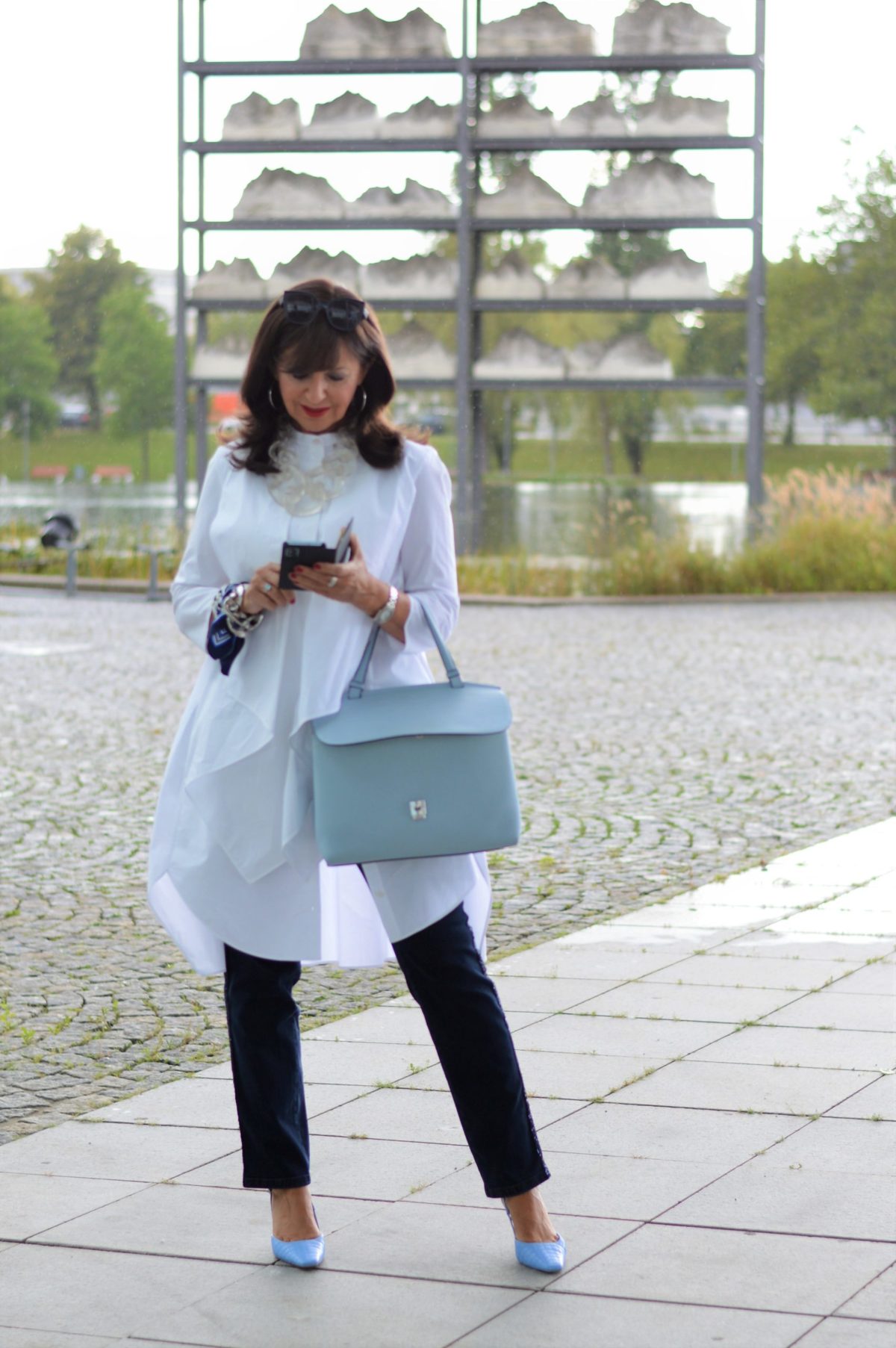 Ich trage auch gerne Jeans und Blusen. Beim Blusenkauf achte ich darauf das sie immer etwas besonderes hat, tollen Kragen, Schnittführung, Manschetten usw., eben etwas was eine Bluse zu einem aussergewöhnlichen Teil macht.