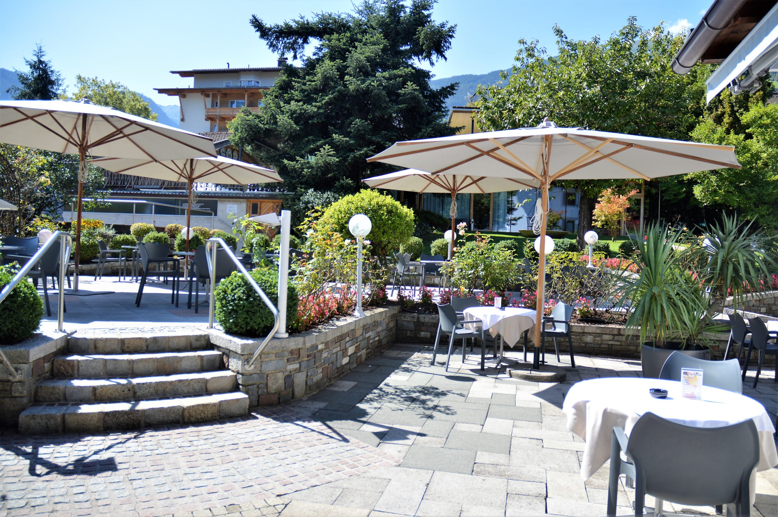 Auf der Sonnenterrasse hatte ich zweimal die Möglichkeit, ein ausgiebiges Frühstück zu genießen. Von der Terrasse aus blickt man auf den umliegenden Garten, den Green Pool und die Bergkette der Tuxer, Kitzbühler und Zillertaler Alpen.