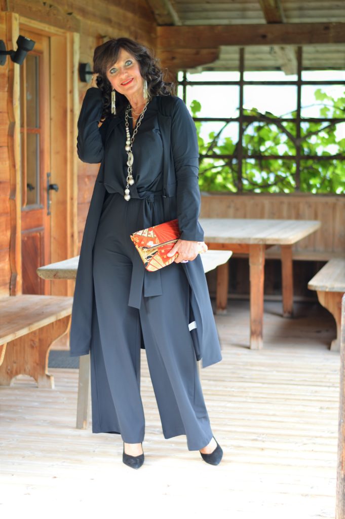 Meine Kombination besteht aus einem Jumpsuit mit ¾ Ärmeln und einem passenden Mantel dazu. Was wurde ich schon oft auf dieses Outfit angesprochen. Klar, die pure und gleichzeitig avantgardistische Schnittführung ist nicht an jeder Ecke zu finden. Schwarz sieht edel aus – und wenn es extravagant vom Design ist, fällt es auf jeden Fall auf. Die passenden Accessoires runden einen perfekten Look ab. Meine lange Kette und die Clutch sind ein idealer Partner, um den Look zusätzlich gekonnt wirken zu lassen.
