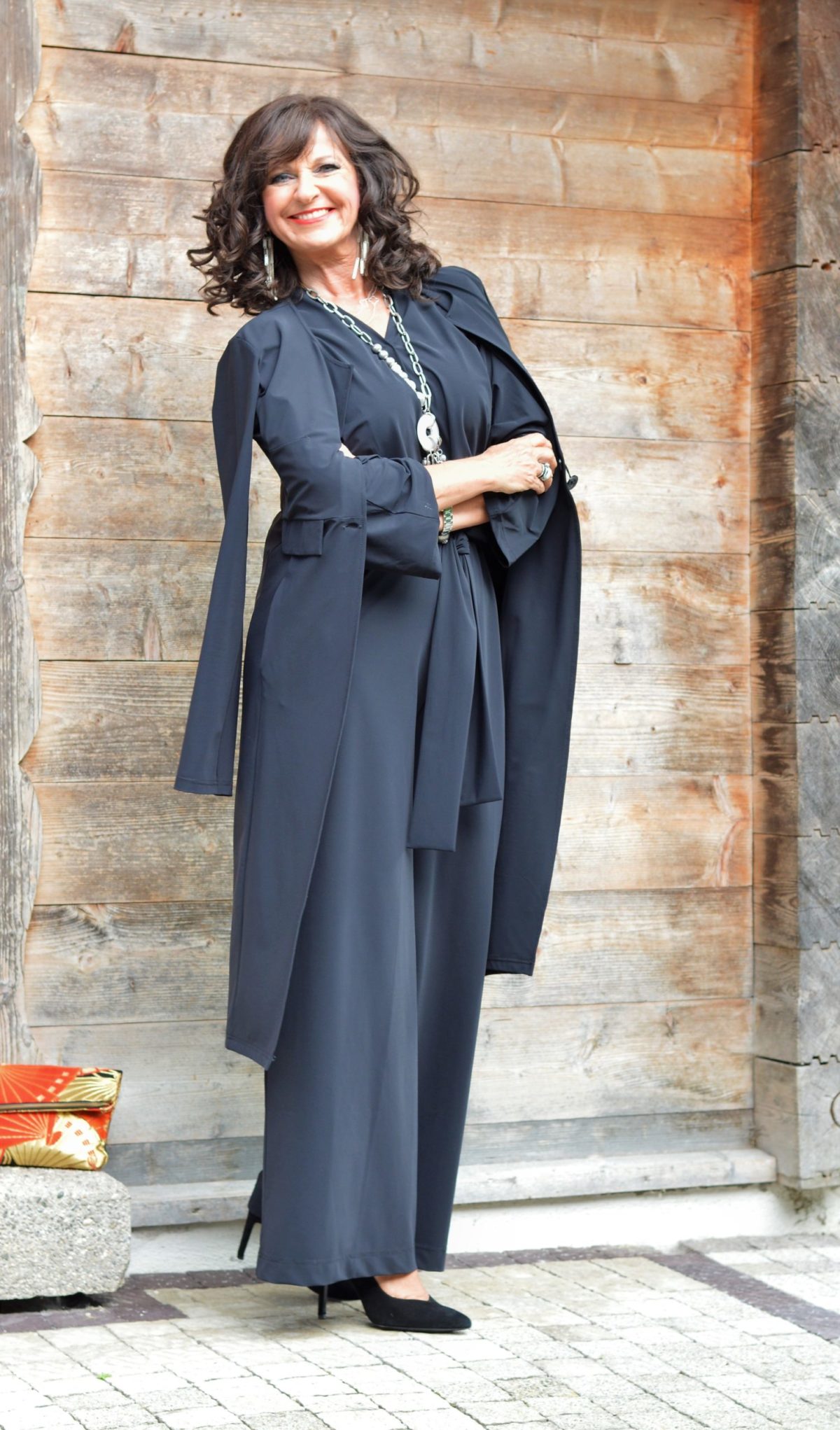 Meine Kombination besteht aus einem Jumpsuit mit ¾ Ärmeln und einem passenden Mantel dazu. Was wurde ich schon oft auf dieses Outfit angesprochen. Klar, die pure und gleichzeitig avantgardistische Schnittführung ist nicht an jeder Ecke zu finden. Schwarz sieht edel aus – und wenn es extravagant vom Design ist, fällt es auf jeden Fall auf. Die passenden Accessoires runden einen perfekten Look ab. Meine lange Kette und die Clutch sind ein idealer Partner, um den Look zusätzlich gekonnt wirken zu lassen.