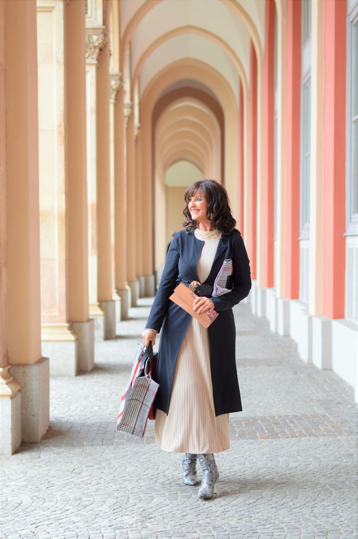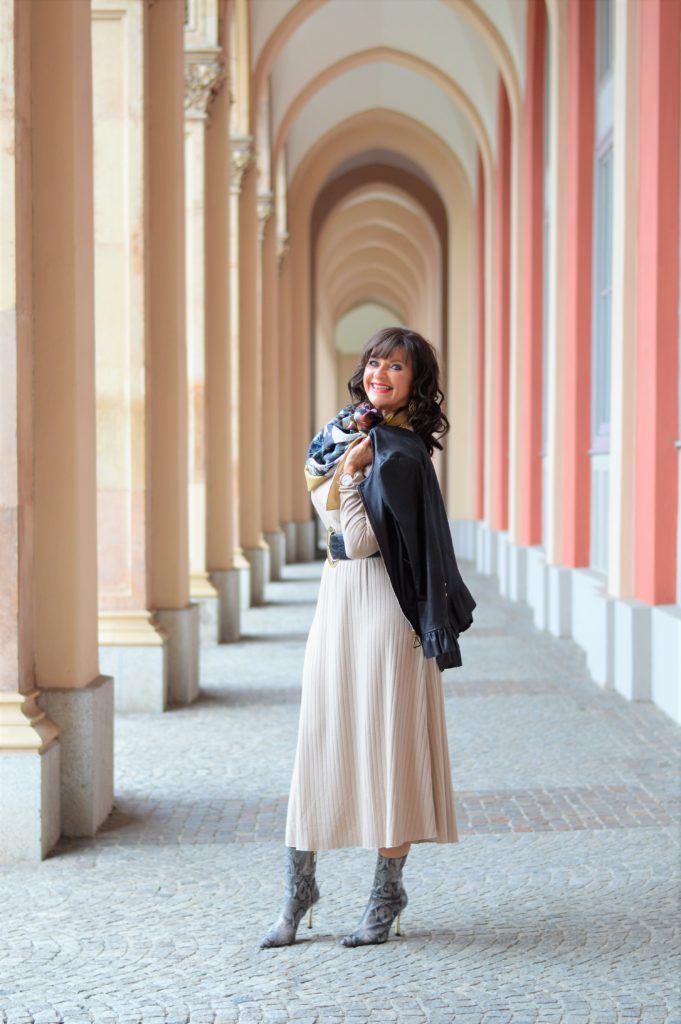 Sehr chic sieht das beige Kleid in Kombination mit dem schwarzen Mantel aus. Ich liebe Tücher und habe auch bemerkt, dass gerade Kleider im Herbst/Winter 2020/2021 sehr angesagt sind. Auch in Kombination mit einem kurzen einfarbigen Pulli, was ich mir anfangs gar nicht vorstellen konnte. Was meinst du dazu?