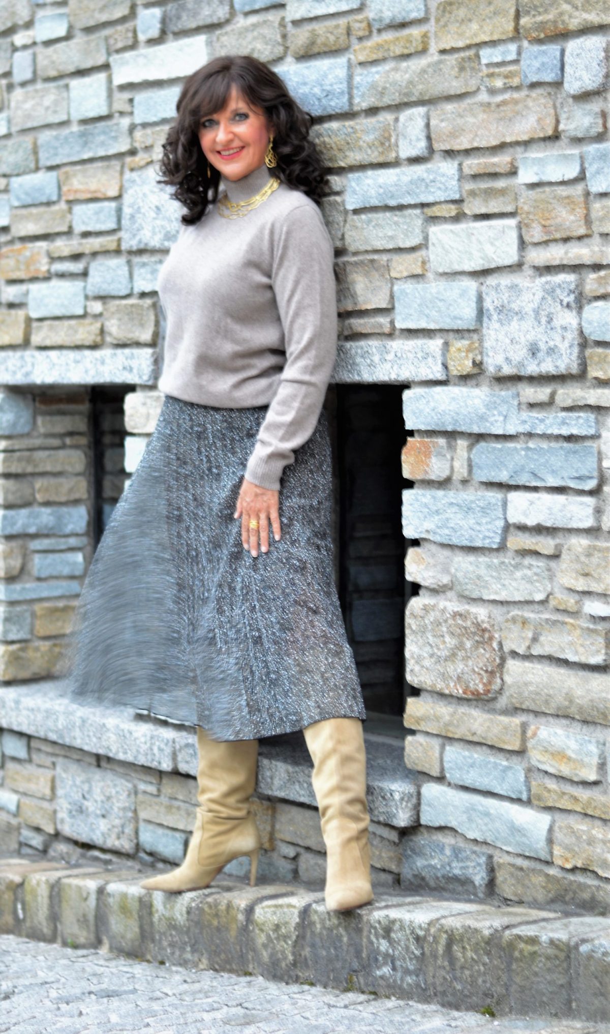 Mein Outfit zu Hause ist niemals der Schlabberlook oder das ausgewaschene Shirt. Ich greife lieber zum kuscheligen Kaschmir Pulli, denn mir ist in der Übergangszeit häufig extrem kalt. Bequem soll mein Sonntags-Outfit auf jeden Fall sein, gleichzeitig vorzeigbar. Der Plisseerock mit minimalem Animalprint und dem bequemen Rundumbund passt daher genau zum Pullover. Ein unkomplizierter Rock, in den ich einfach reinschlüpfen kann, da er weder Knöpfe noch Reißverschluss hat. Und wenn ich vor die Tür gehe, trage ich dazu am liebsten schicke Stiefel.