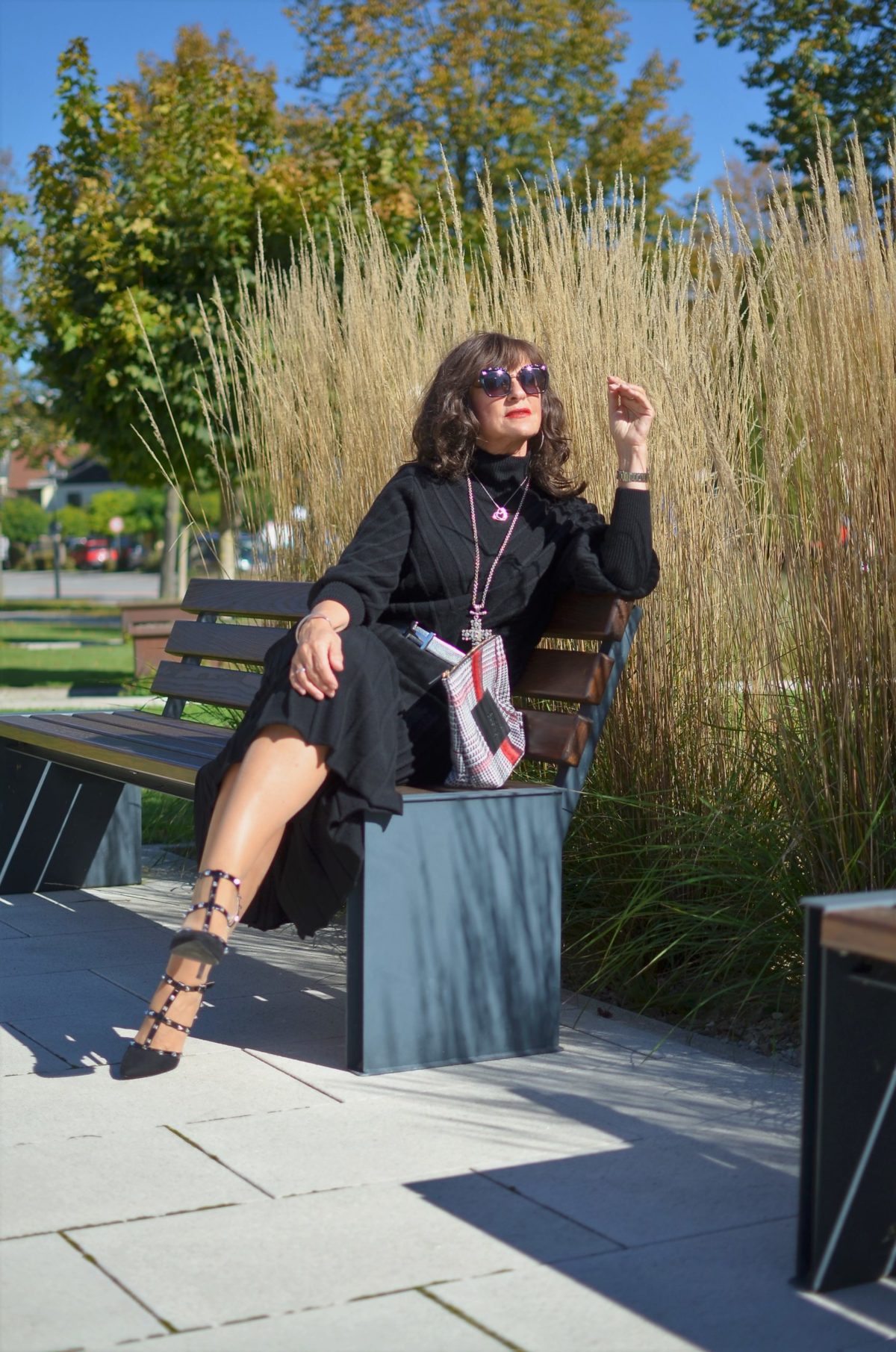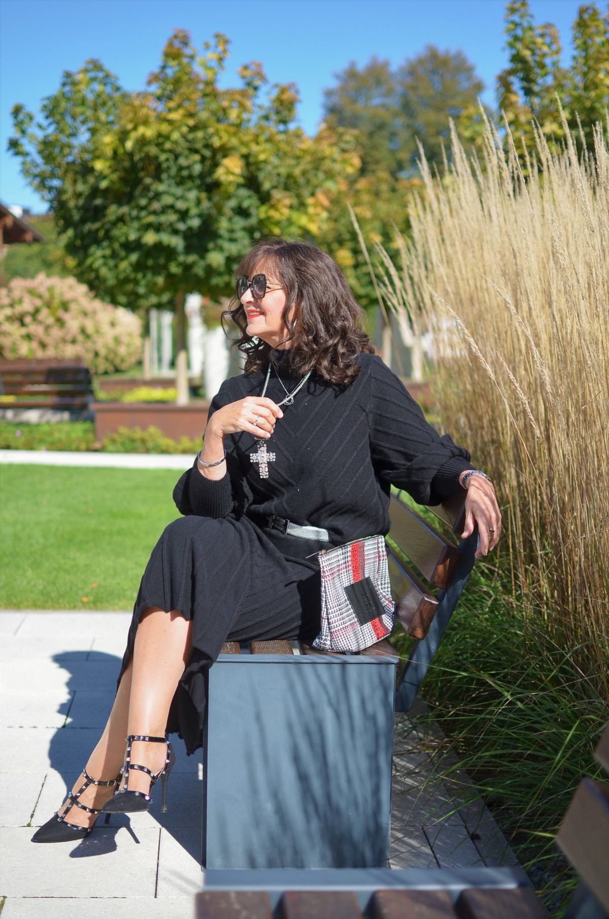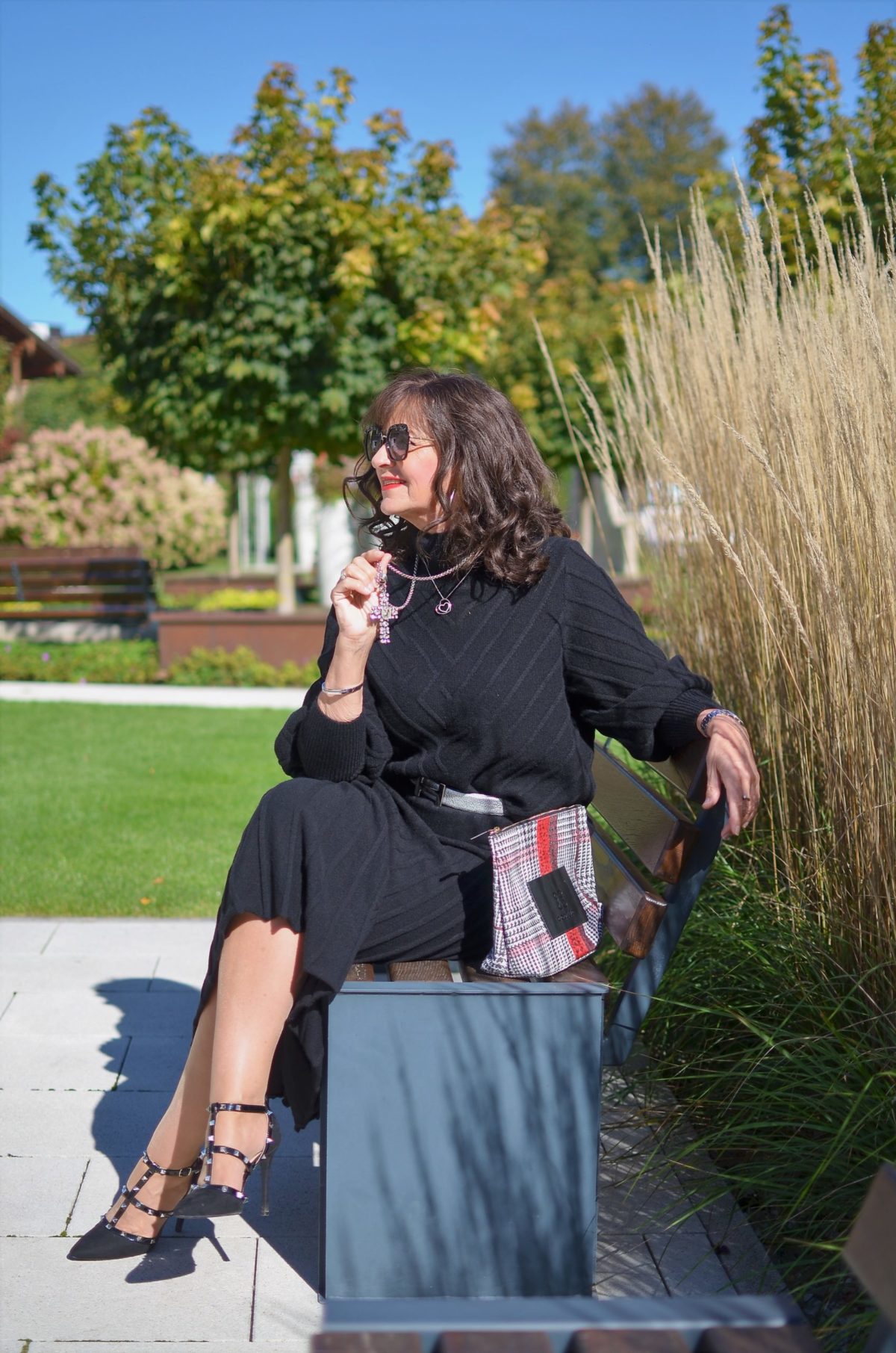 Für mich gehört zu jedem Outfit das richtige Accessoire. Heute habe ich mich für eine auffällige Statement-Kette mit großem Herz und zusätzlich für eine kleinere Herzkette entschieden. Dazu kombiniere ich einen silberfarbigen Gürtel. Die kleine Clutch passt durch den Mustermix von Glencheck sehr gut zum gesamten Outfit in schwarz.