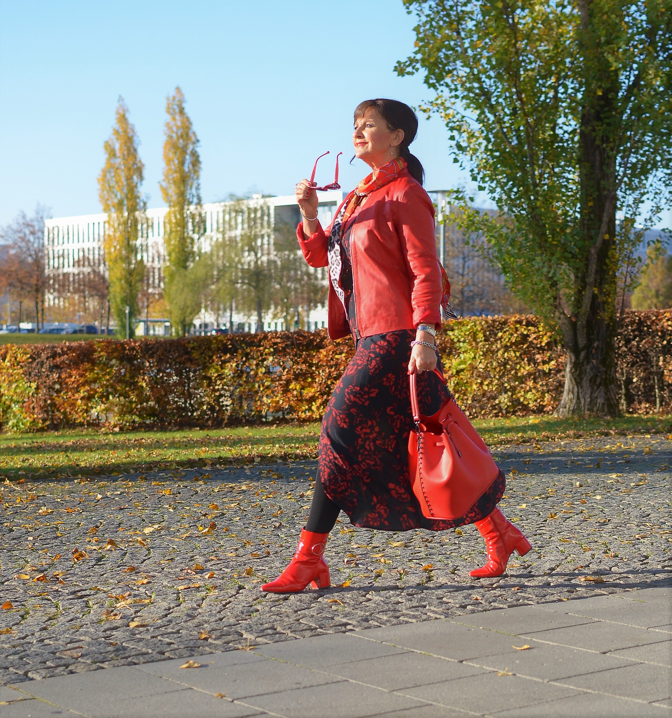 Maxikleid und Lederjacke sind ein Duo, das sich perfekt ergänzt. Mit den roten Stiefeletten, die einen kleinen Absatz haben, wirkt man definitiv etwas größer. Bei einem Maxikleid sollte man immer Schuhe mit etwas Absatz tragen. Es lässt die Beine damit länger erscheinen. Ob es eine auffällig rote Lederjacke oder die dezente Schwarze ist, das wähle ich je nach Lust und Laune aus.