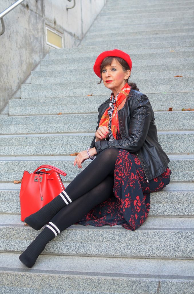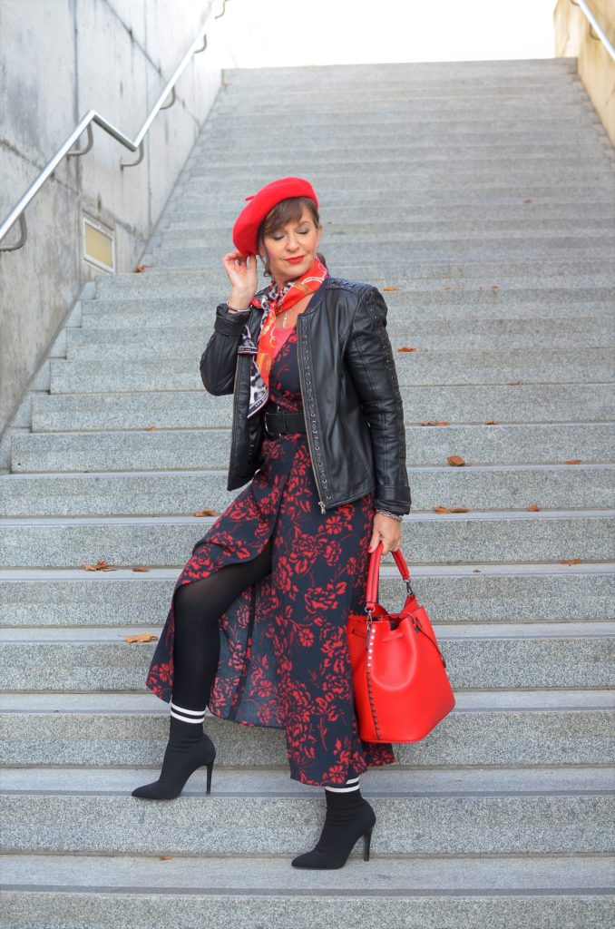 Rot wird niemals übersehen. Deshalb habe ich die Accessoires auf den Farbeffekt des Kleides abgestimmt. Rote Stiefeletten, roten Shopper und rotes Barett sind meine Hauptaccessoires bei meinem heutigen Look. Ein Barett ist für mich eine absolute stylische Alternative zu einer Mütze. Der Schmuck ist dezent und reduziert gewählt.