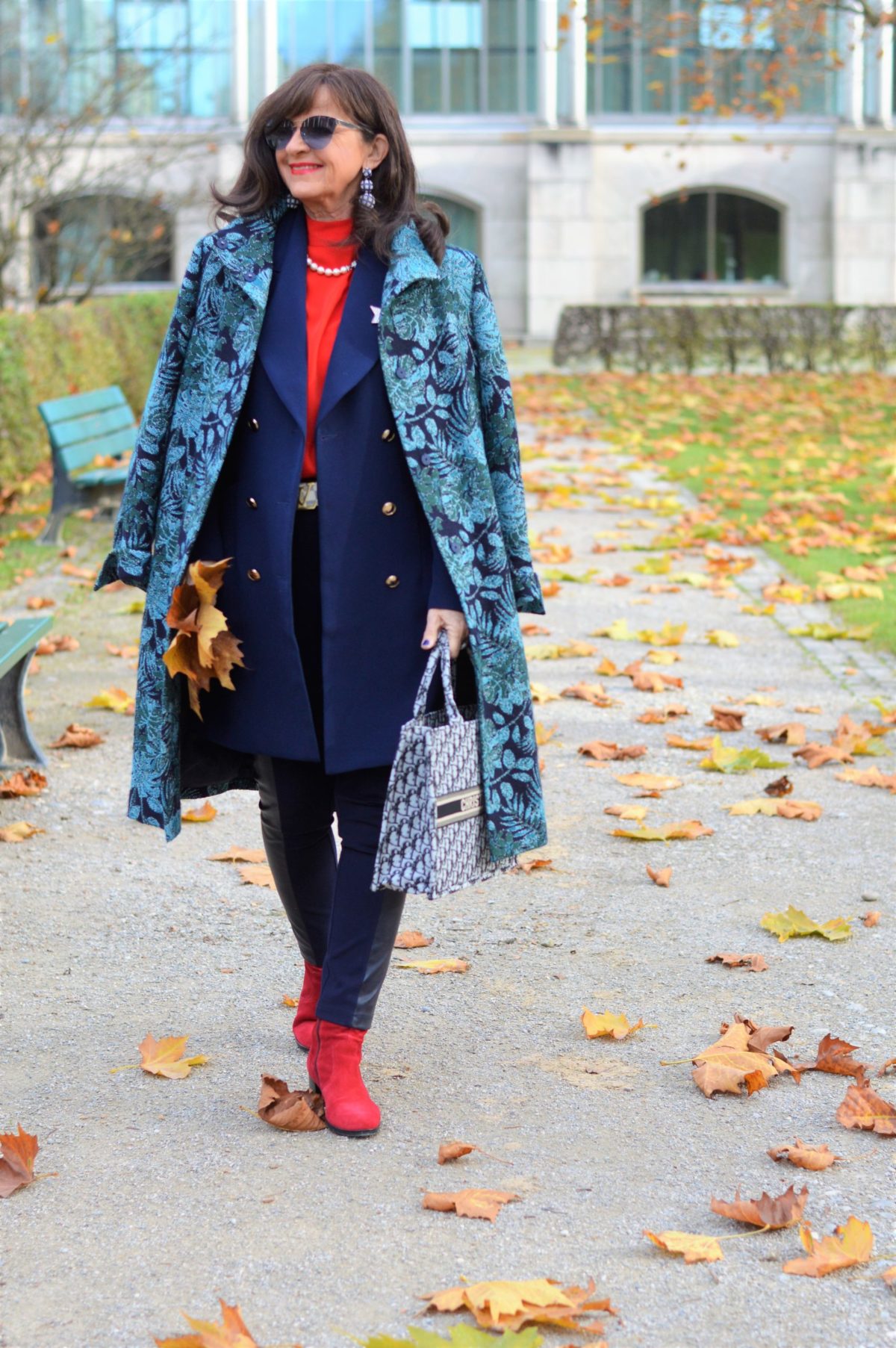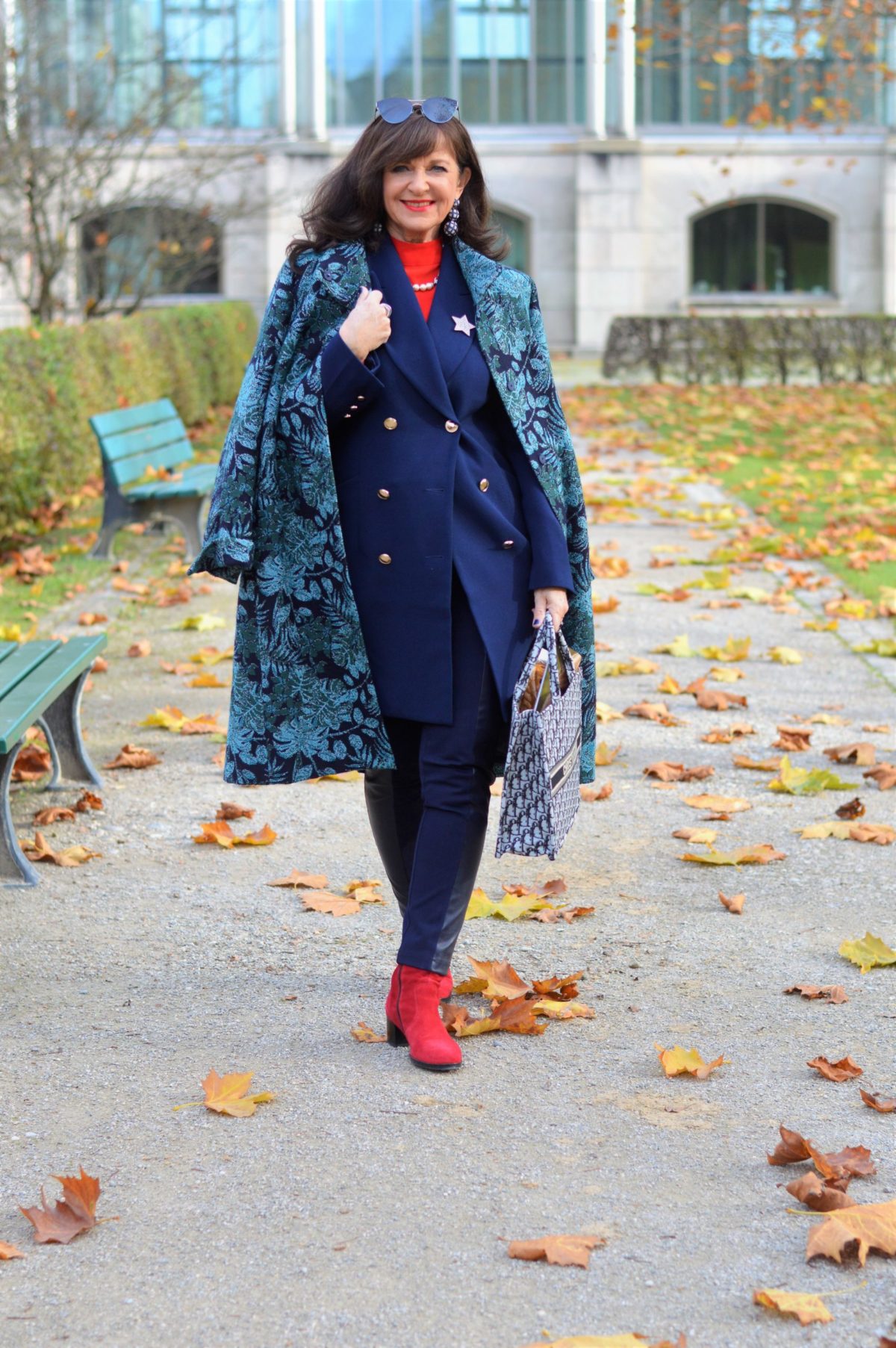 Ob wir einen Schaufenster-Bummel machen, ja das gibt es wieder, oder uns mit einem Lieblingsmenschen treffen. Der Look mit Blazermantel, rotem Rolli und roten Stiefeletten gefällt mir besonders gut, da die roten Akzente ein zusätzlicher Eyecatcher sind. Mein Mantel im Mustermix Blau-Grün gibt dem Outfit einen zusätzlichen Farbeffekt. Wichtig ist dabei, dass alles aus einer Farbfamilie stammt.
