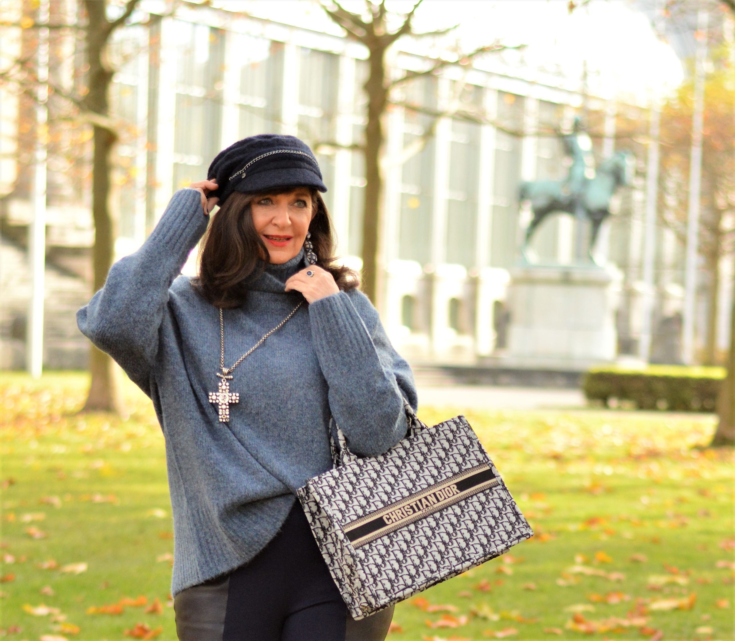 Uns allen fehlen die Umarmungen. Deshalb trage ich aktuell in der Freizeit und am Wochenende so gerne kuschelige XL-Pullis. Sie sind flauschig und streicheln uns ganz sanft auf der Haut. Ton in Ton im Casual Look kombiniere ich als Eyecatcher einen blauen Elbsegler dazu. Keine Ahnung warum, aber diese Art von Kopfbedeckung kommt bei der Männerwelt gar nicht gut an. Egal, Hauptsache ist, dass wir uns gut gefallen.