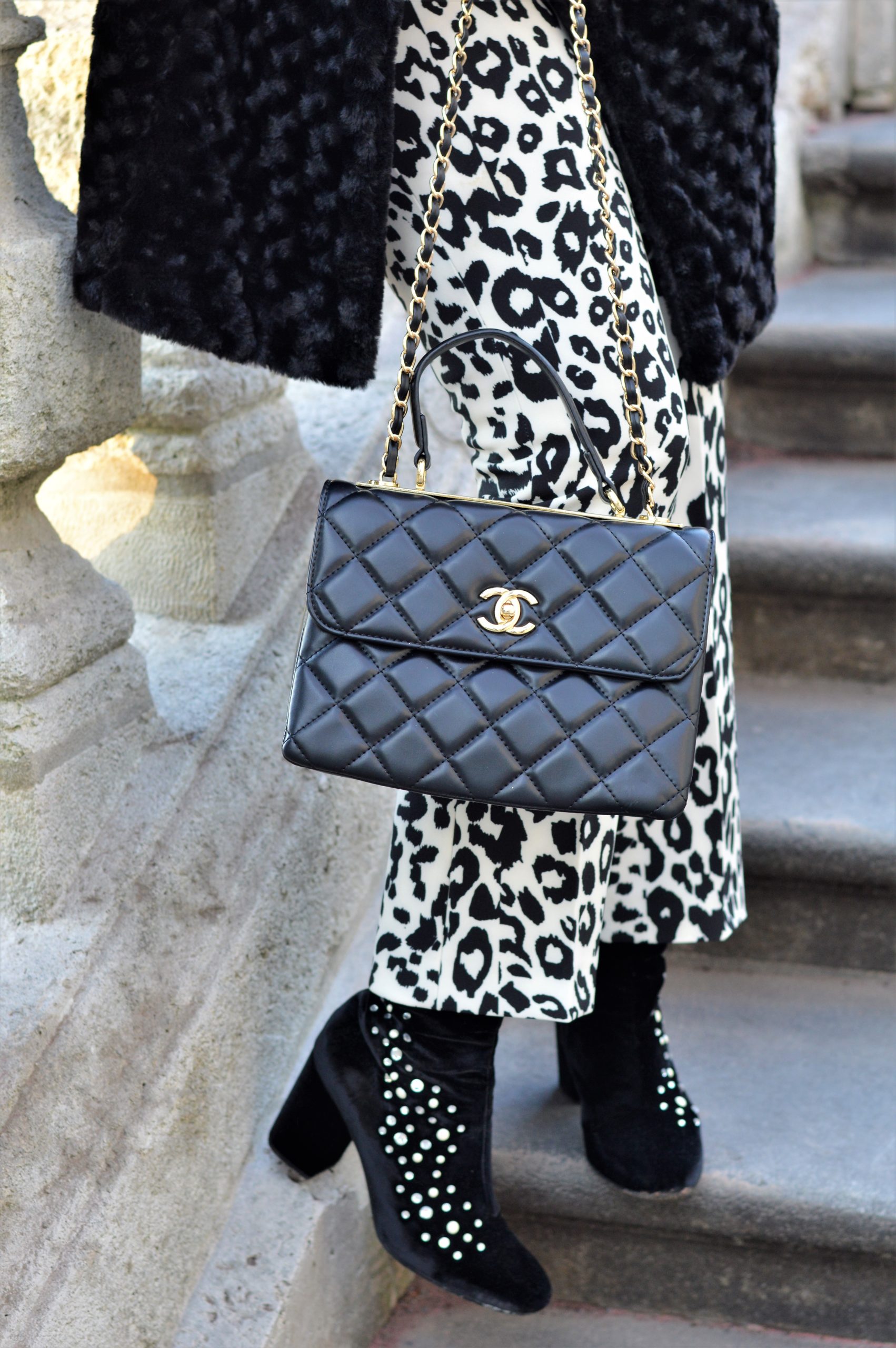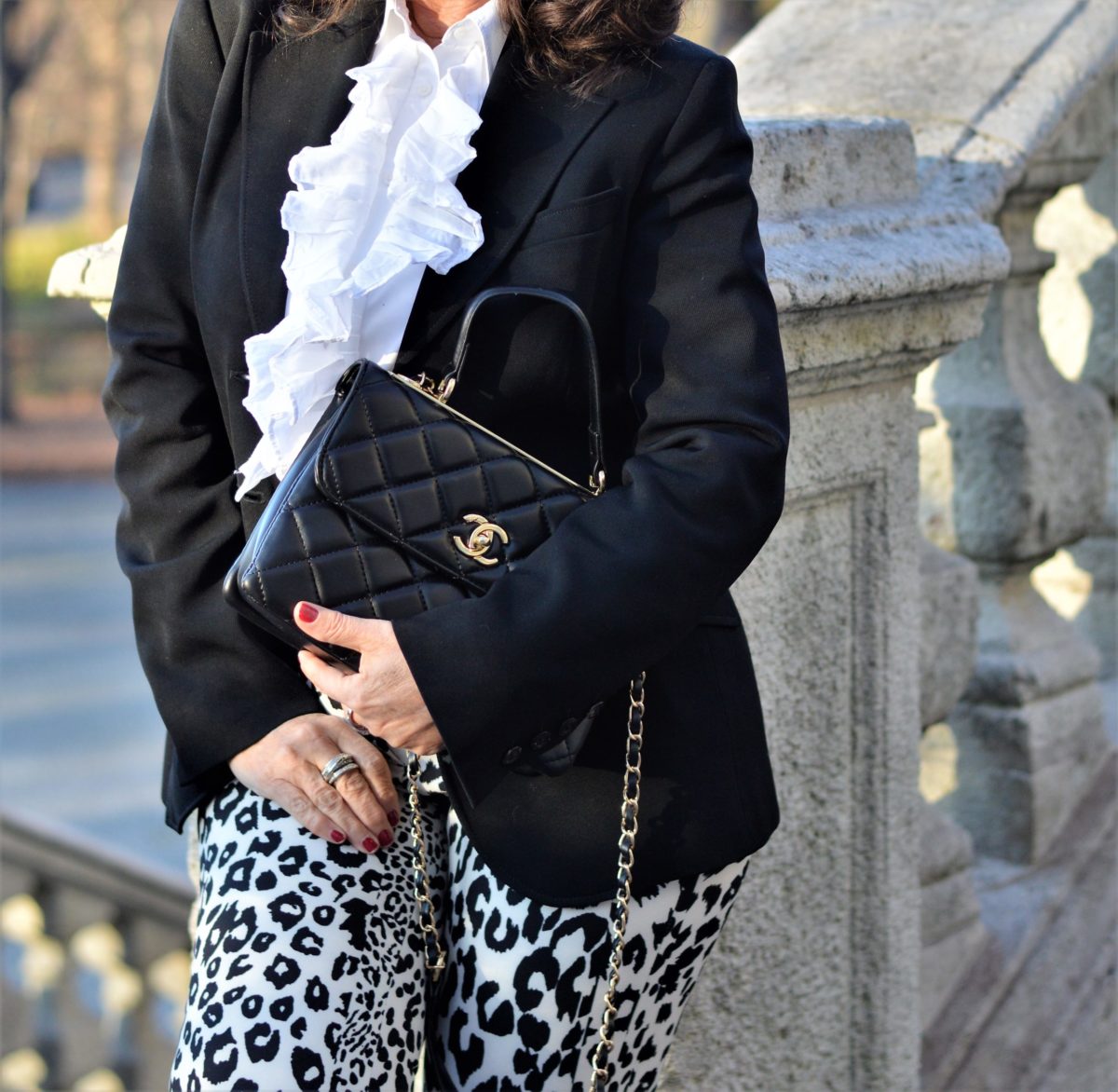 Black and White – eine Kombination, die ich als Wintertyp immer gerne trage. Die tolle Hose im schwarz-weißen Animalprint ist eine meiner liebsten Hosen. Sie ist extravagant und braucht nicht viel Drum Herum, um seine Wirkung voll zu entfalten. Ich kombiniere sie mit einer meiner Rüschenblusen. Ein klassischer schwarzer Blazer darüber und Stiefeletten mit Straßsteinchen. Fertig ist ein toller Look, der noch mit den richtigen Accessoires wie Handtasche und Lippenstift seinen letzten Schliff erhält.