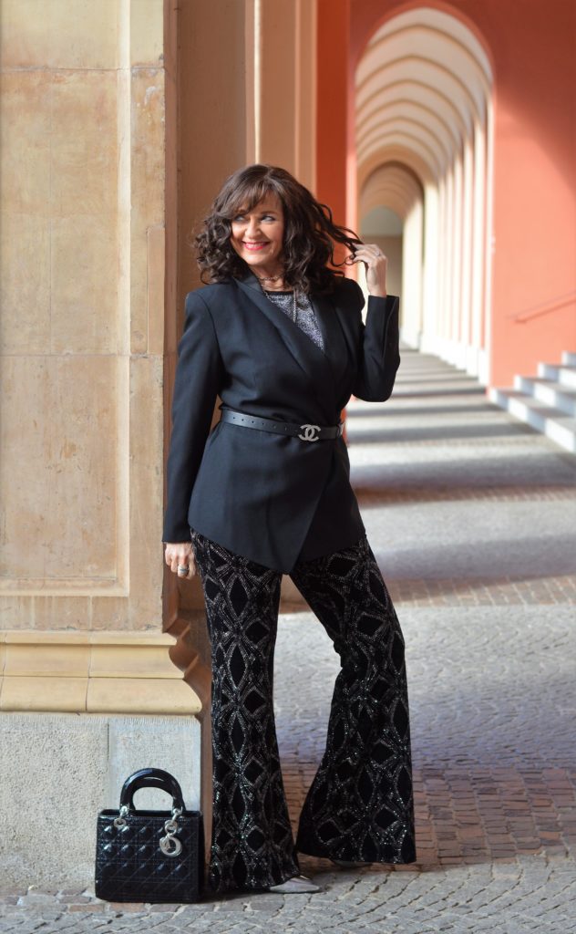 Über die Smoking-Jacke trage ich einen schmaleren Gürtel mit auffälliger Gürtelschnalle. Die Hosenform ist ausgestellt und erinnert mich an meine Zeit als junge Erwachsene. Die Zeit von Disko und wöchentlichen Tanzvergnügen. Wo ist die Zeit nur geblieben?