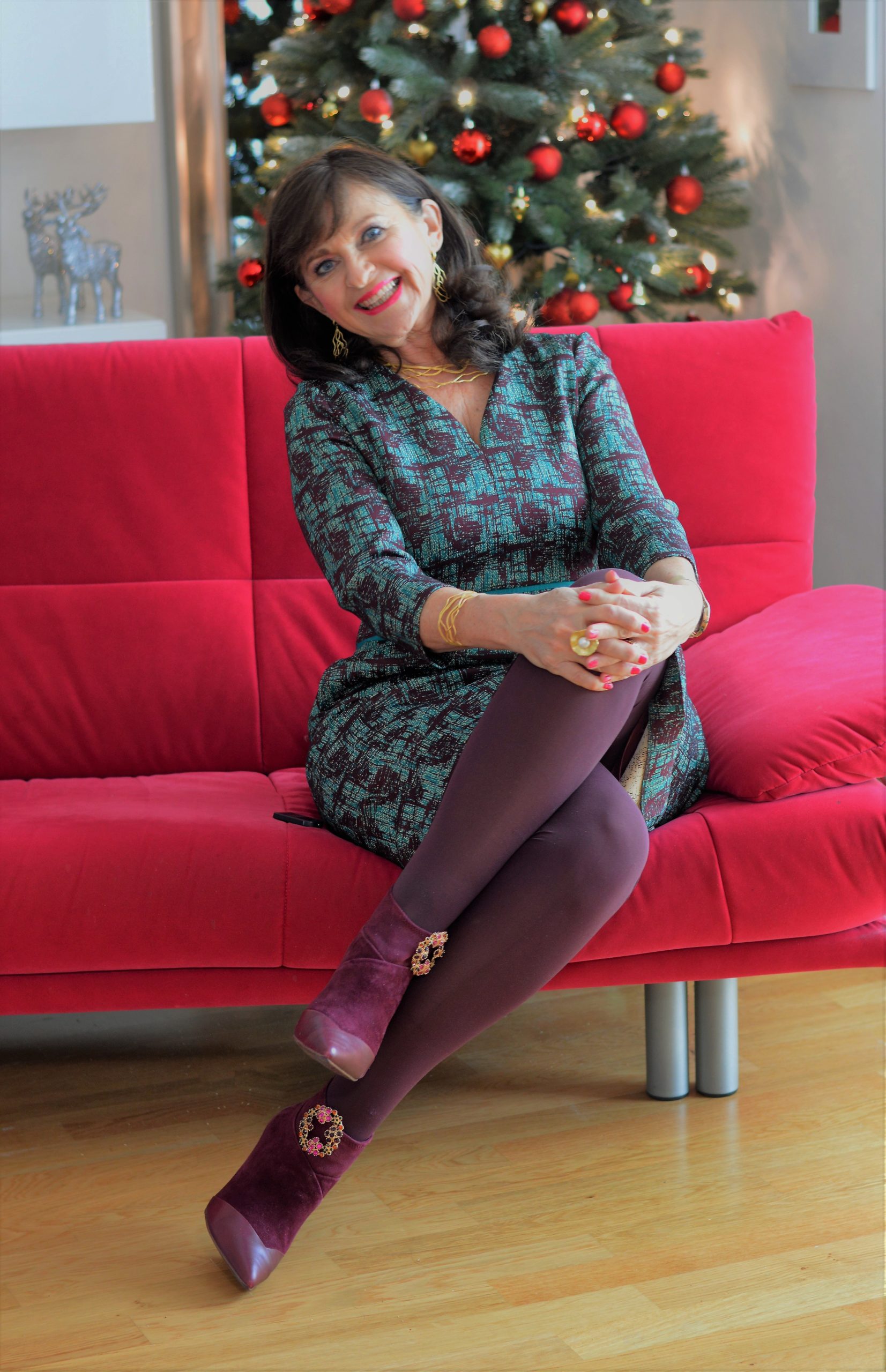 Mit dieser tollen Farbe stehle ich dem Weihnachtsbaum die Show. Na ja, nicht ganz. Die Farbe ist wunderschön und wie viele wissen, eine meiner Lieblingsfarben. Toller Schmuck in Silber und schwarze Accessoires sind meine Kombipartner für dieses Kleid. Der absolute Hingucker ist die Strumpfhose mit pinkem Karomuster.