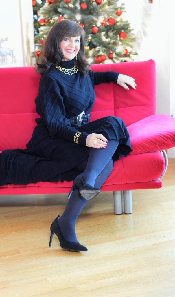 Wer Wert auf Bequemlichkeit an den Feiertagen legt, ist in einem Strickkleid gut gekleidet. Es sieht mit dem angesagten Karomuster überaus modern aus, obwohl ich es bereits 2 Jahre habe. Zum Strickkleid gehört der passende Mantel dazu. Als Accessoires trage ich einen breiten Gürtel und eine zauberhafte Brosche dazu. Die Strümpfe können blickdicht in schwarz oder Hautton sein. Beides passt wunderbar zum Strickkleid in grau-schwarz.