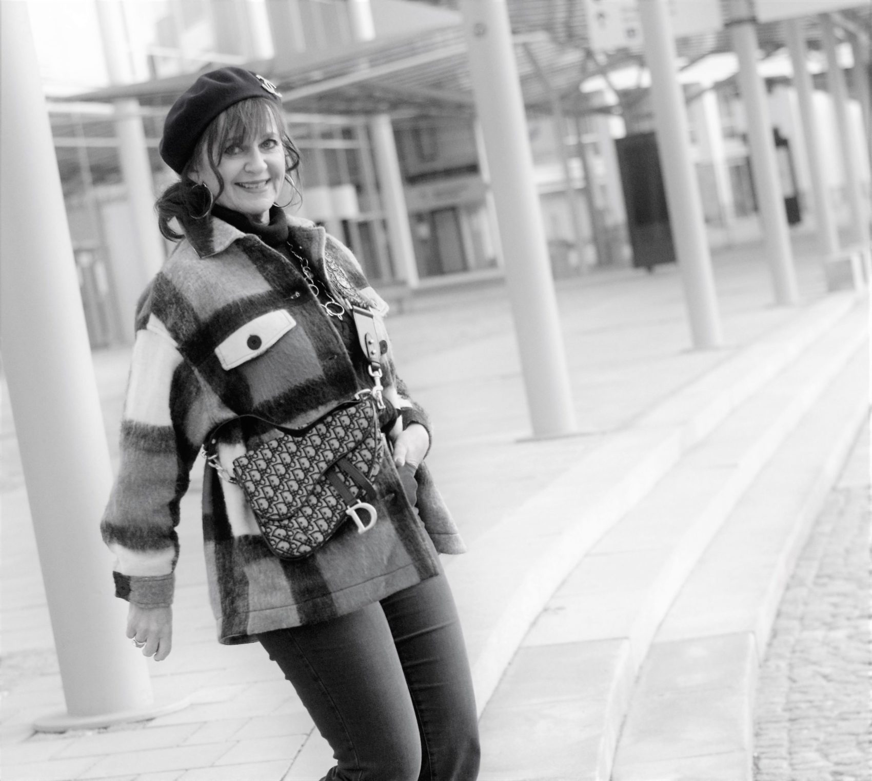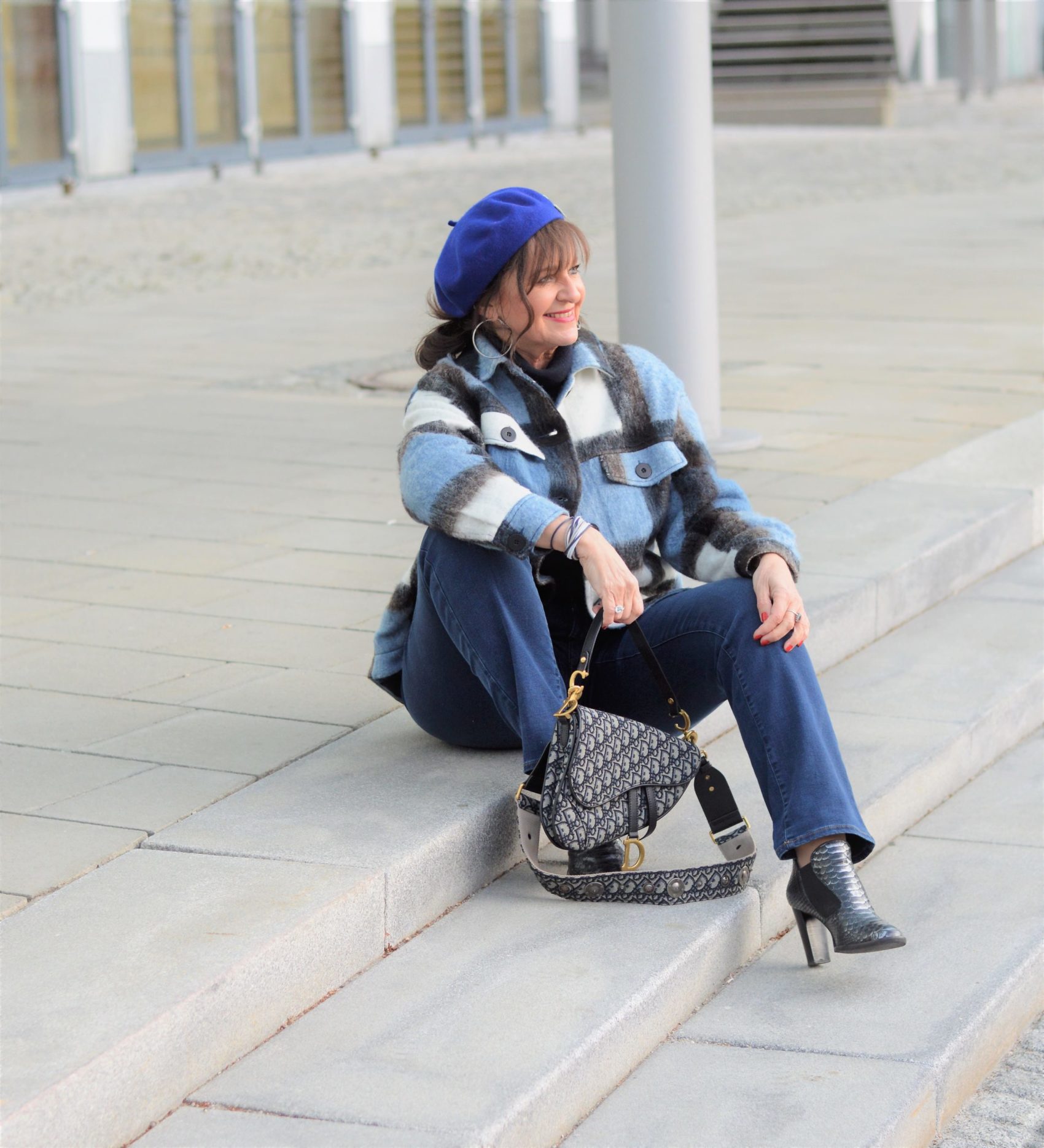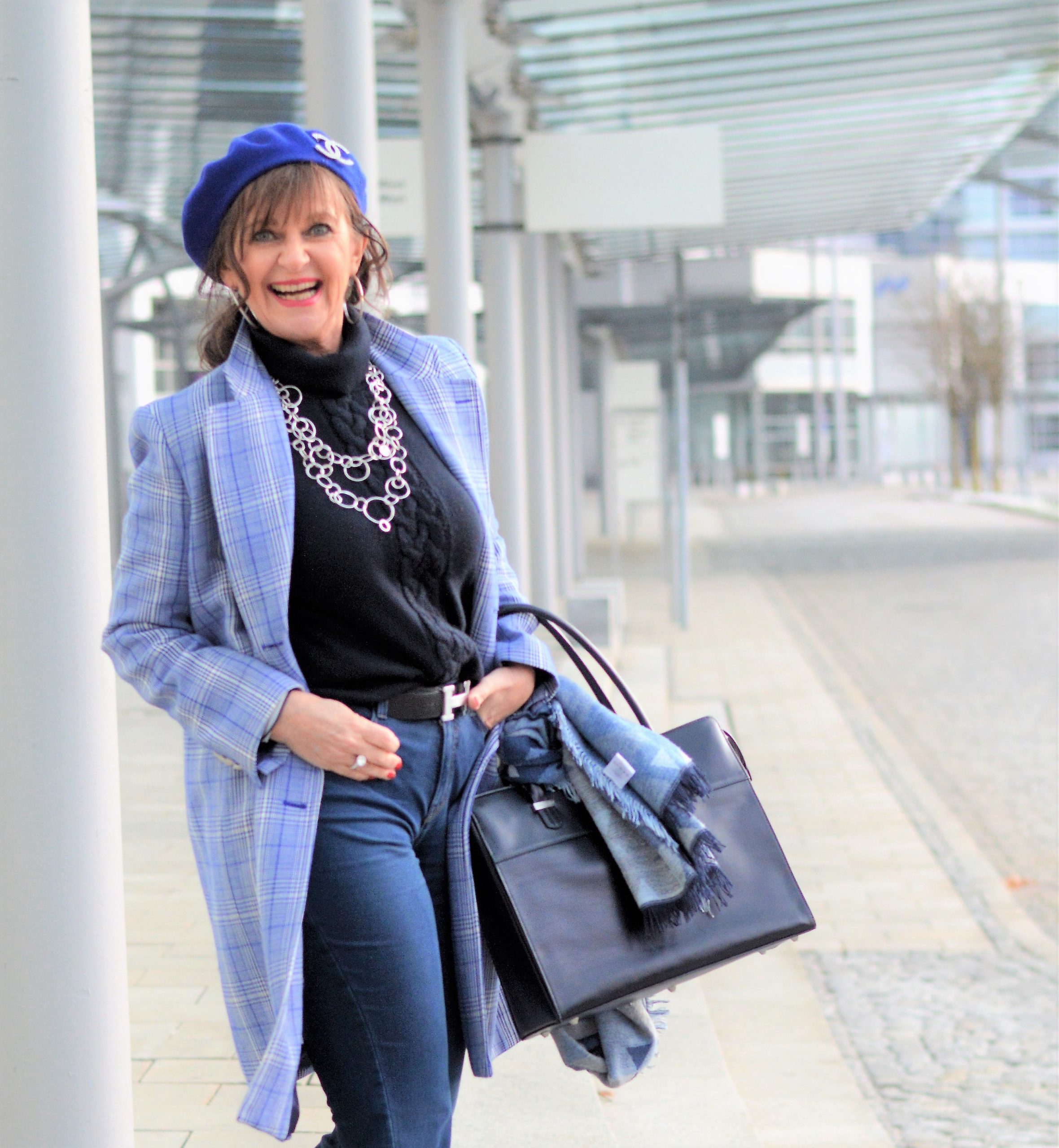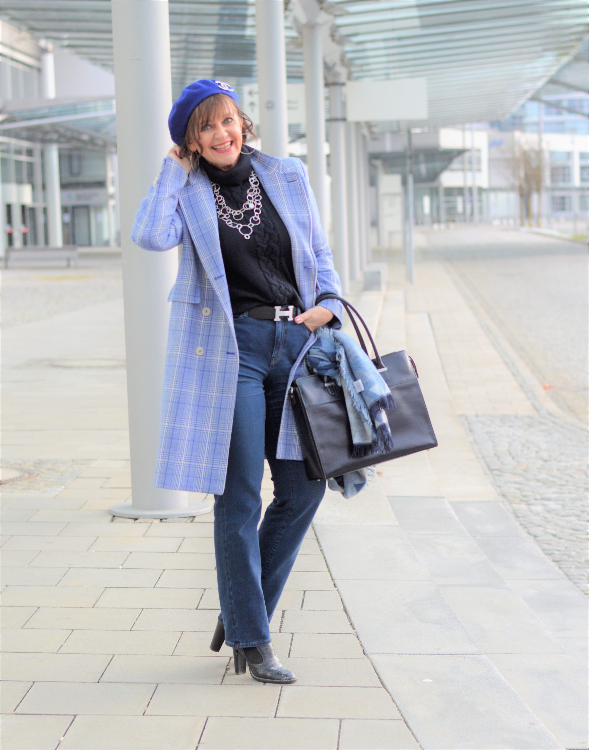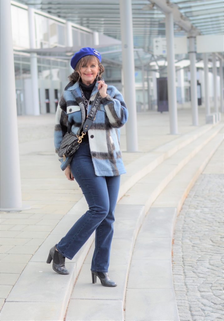 Wenn ich das Haus verlasse, schlüpfe ich in den Karomantel, der ebenfalls in Blaunuancen gemustert ist. Ein stilvolles Barett gehört aktuell fast zu jedem Outdoor-Look bei mir dazu. Die schicke Business Tasche und die Stiefeletten unterstreichen meine Wirkung im monochromen Look. Übrigens, ein Outfit in monochromen Farben, also Ton-in-Ton, lässt uns immer schlanker wirken. Ist nach den Feiertagen gar nicht so verkehrt.